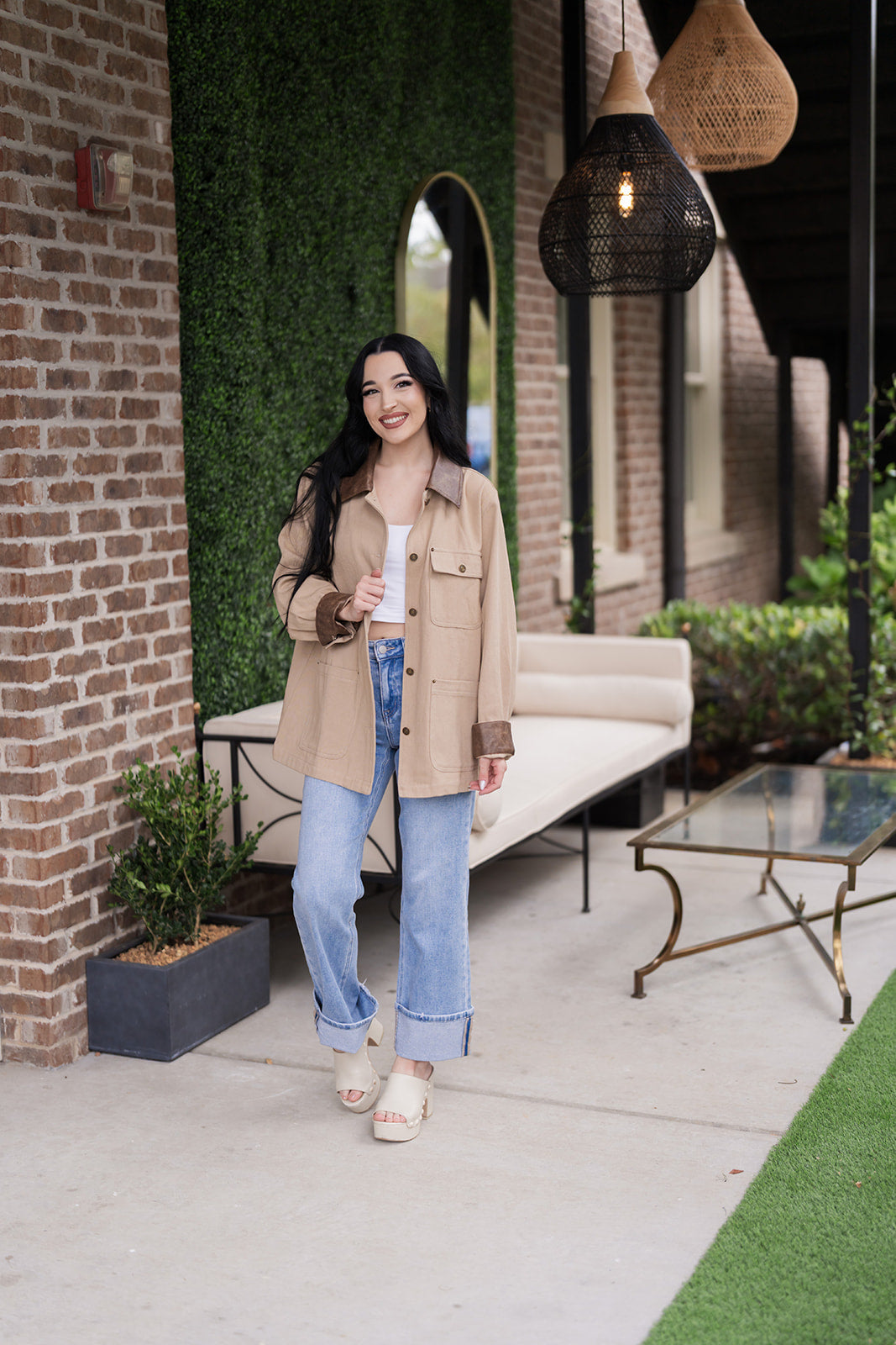 The defining style element is the beautiful, rich faux leather trim on the collar and cuffs, which introduces a luxe, rugged contrast that elevates the entire look from simple jacket to stylish statement piece. The utilitarian design is highly functional, featuring a full button-down front and two generously sized, patch flap pockets at the chest—perfect for keeping small essentials secure. The relaxed, comfortable fit is specifically designed for seamless layering over thick turtlenecks, cozy sweaters, or a basic long-sleeve tee. Whether you’re running errands on a brisk morning, heading to a casual dinner, or just looking for a chic piece of women's outerwear to complete your look, this khaki utility jacket offers a polished yet easygoing aesthetic. The enduring construction and timeless color palette ensure this shacket will be a beloved staple in your closet for many seasons to come. Shop this must-have jacket now and step out with confidence!