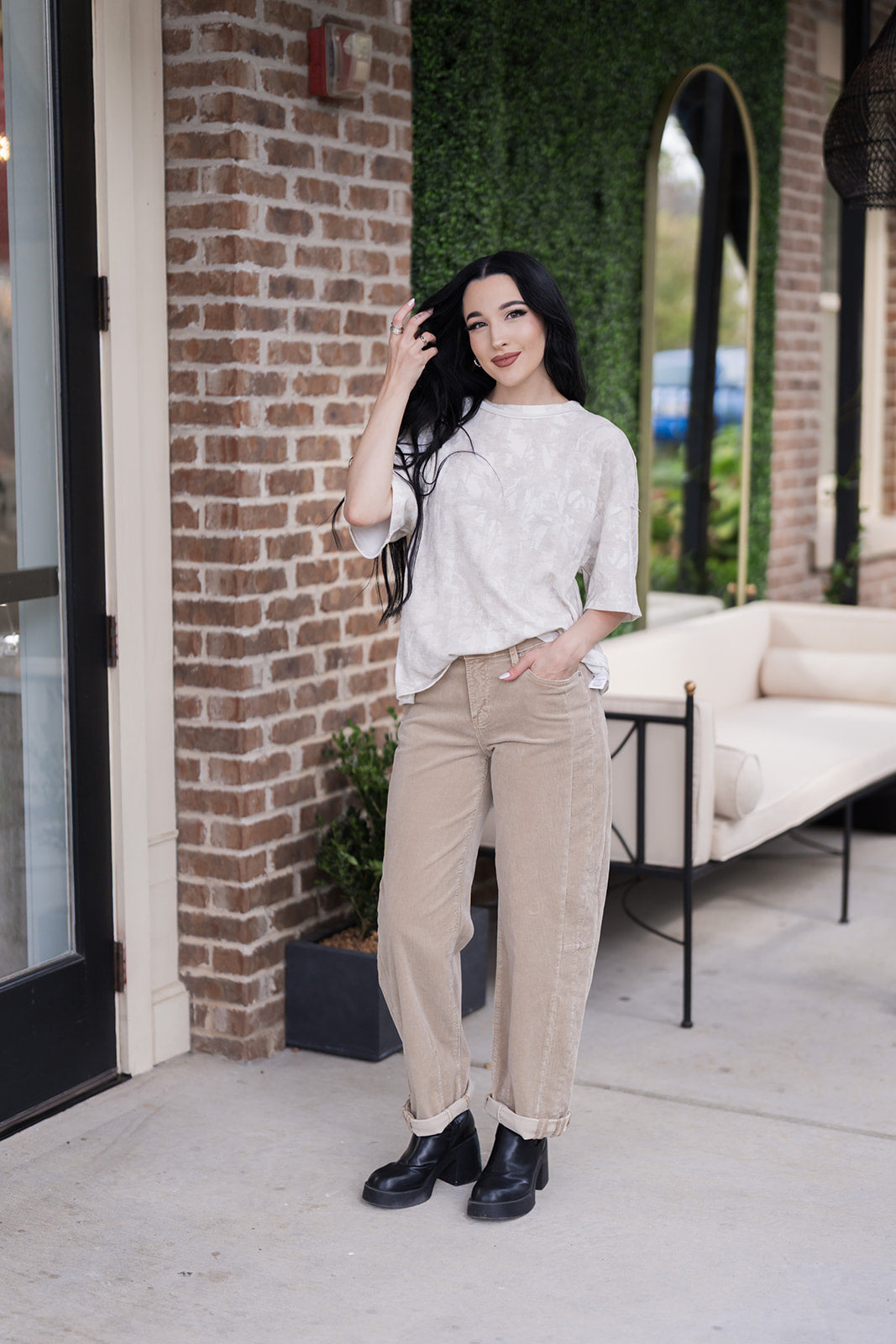The Cinnamon Crop Corduroys are thoughtfully designed with a barrel-leg silhouette that offers a relaxed fit through the thigh and tapers slightly at the hem. The high-rise fit cinches the waist for a flattering shape, and the cropped length with a cuffed hem adds a contemporary flair. The classic five-pocket design provides a familiar feel, while the plush corduroy fabric makes them incredibly comfortable for all-day wear. Their versatility and timeless design make them an essential item you'll reach for again and again, whether you're heading to a coffee shop or a casual fall gathering.