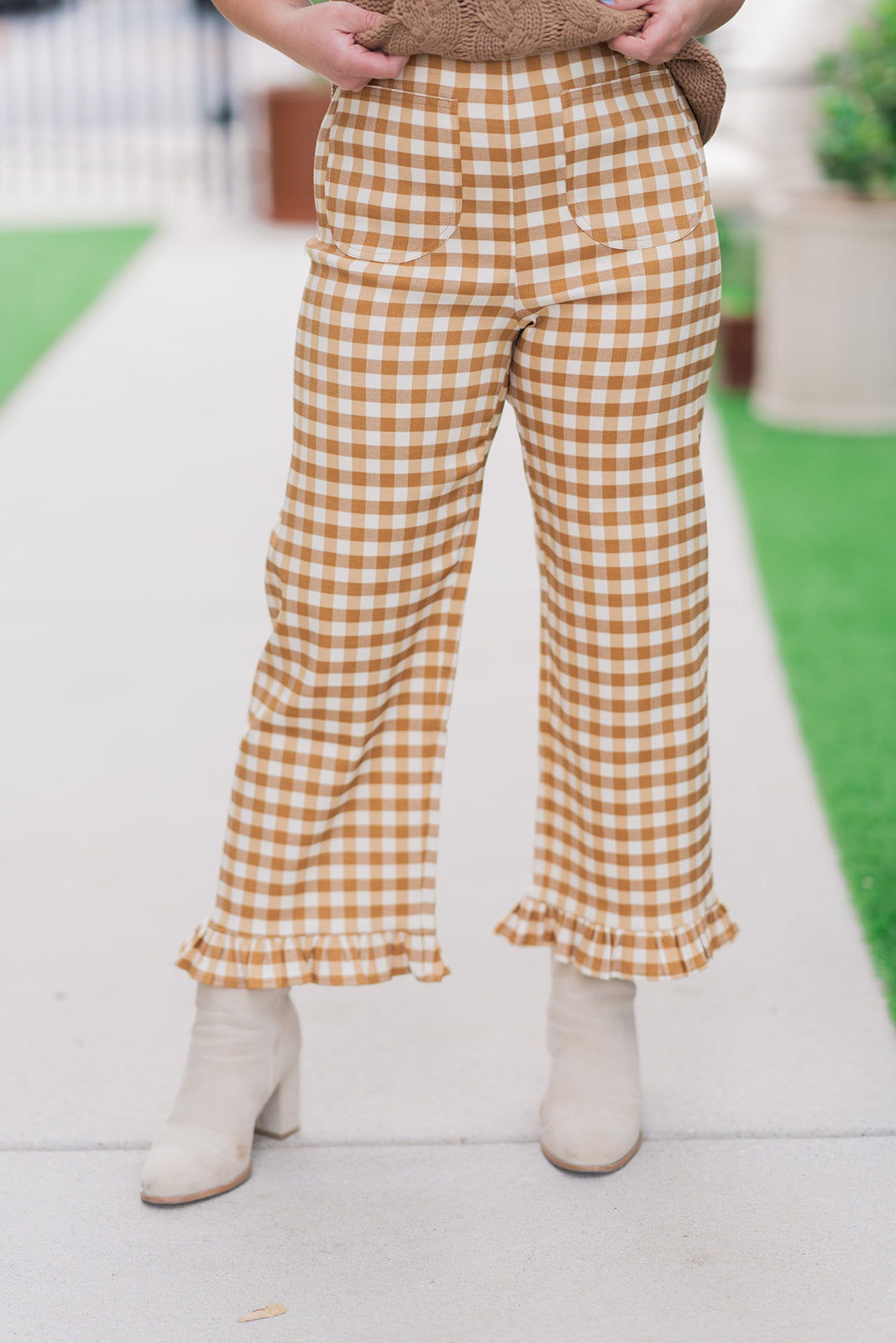 Embrace the sweetness of fall with our Honeycomb Ruffle Pants, a charming blend of classic design and whimsical detail. In a warm "butter toast" color, these pants capture the rich, golden hues of the season. The classic gingham pattern adds a touch of timeless, rustic charm, while the playful ruffle trim on the front pockets elevates them from simple pants to a true statement piece.