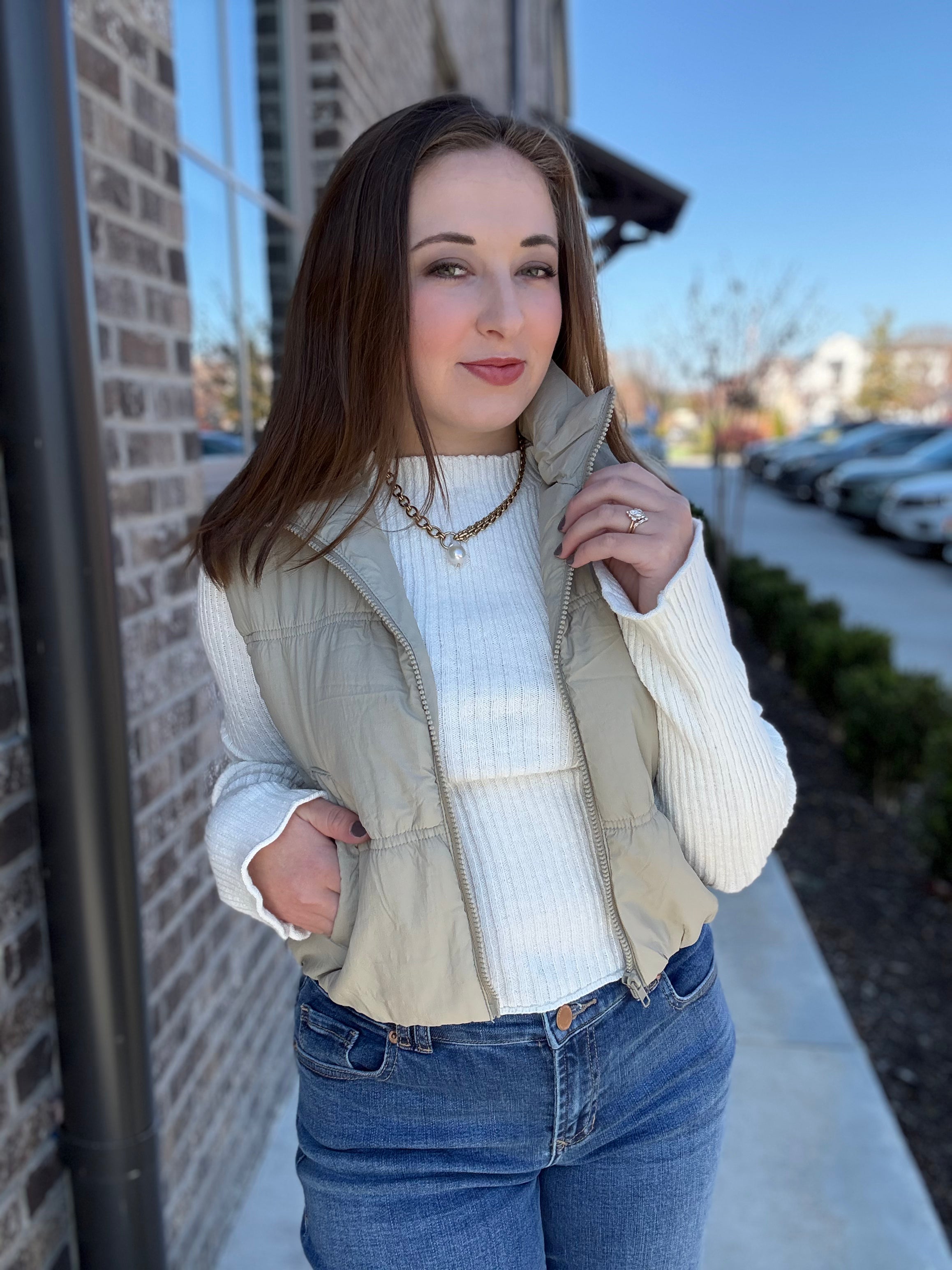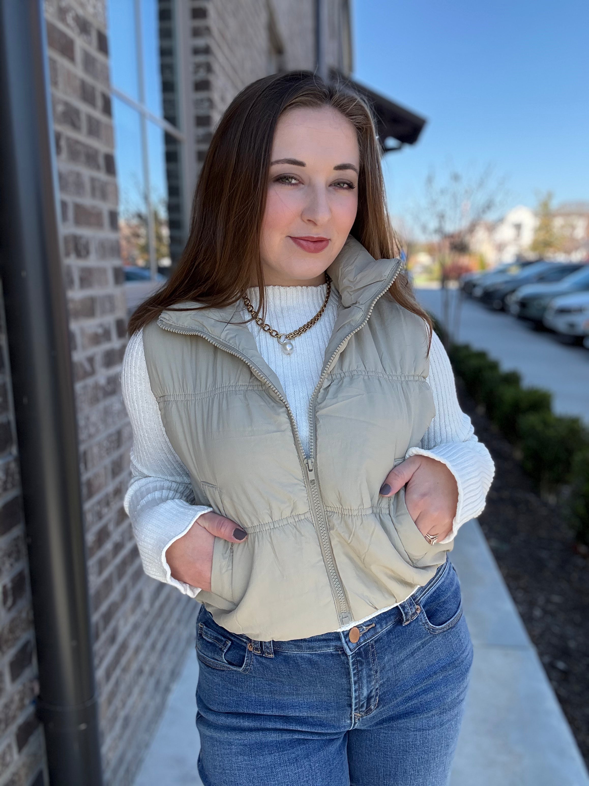 Layer up in effortless, on-trend style with the Alpine Drift Puffer Vest, your new essential for transitional weather. This chic women's vest is crafted from a lightweight, padded shell fabric that provides comfortable warmth without the bulk. Available in two versatile neutral tones—a classic Ivory and a modern Cement (pale khaki/taupe)—this vest is designed to be the perfect finishing touch to any cold-weather outfit.