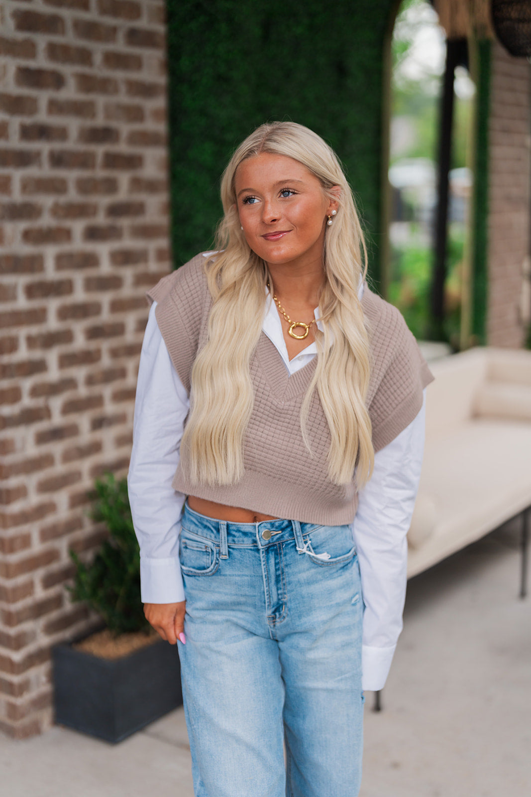 The Cambridge Sweater is designed with a modern, cropped silhouette and a flattering V-neckline that beautifully showcases the classic collar of the shirt underneath. The long sleeves of the white shirt can be worn down or rolled up, offering versatile styling options. This piece is perfect for anyone who loves fashion that is both sophisticated and effortless. Whether you're dressing it up for a day at the office or keeping it casual for a weekend outing, this mixed-media sweater ensures you will always look put-together and chic.