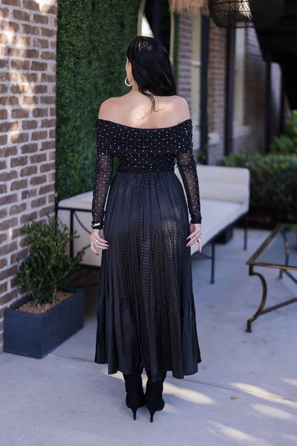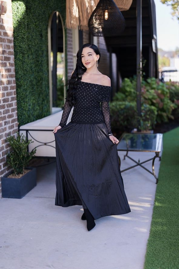 The Muse Skirt is designed with a high, smocked elastic waistband, ensuring a comfortable and customizable fit that beautifully defines your figure. The midi-length skirt is perfect for a variety of occasions, from a dressy evening out to a casual daytime gathering. Its luxurious feel and graceful movement make it a versatile piece that can be dressed up or down with ease. Available in two stunning colors—a classic black and a rich, deep red—this pleated skirt will be a staple in your wardrobe for seasons to come.