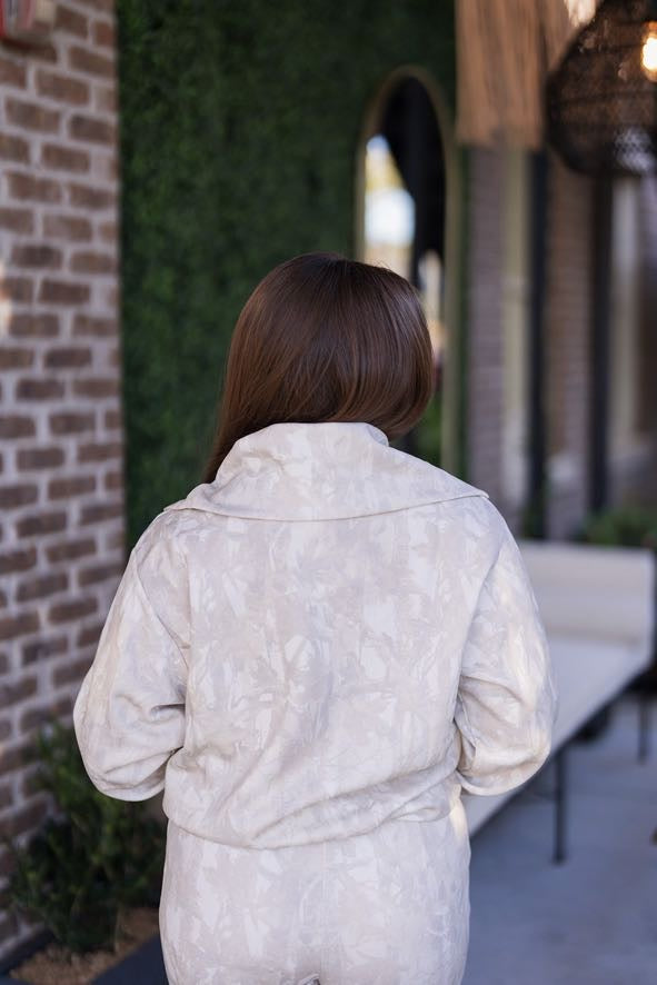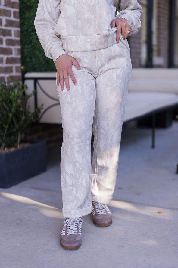 Experience the pinnacle of cozy comfort and subtle style with the Penelope Lounge Set, your new favorite two-piece essential. This women's set unites pleasure and function, offering the ultimate in relaxed wear without sacrificing a polished look. Both the top and bottom are crafted from a luxuriously soft fabric in a chic light grey camo print, giving the traditional loungewear silhouette a modern, elevated update.