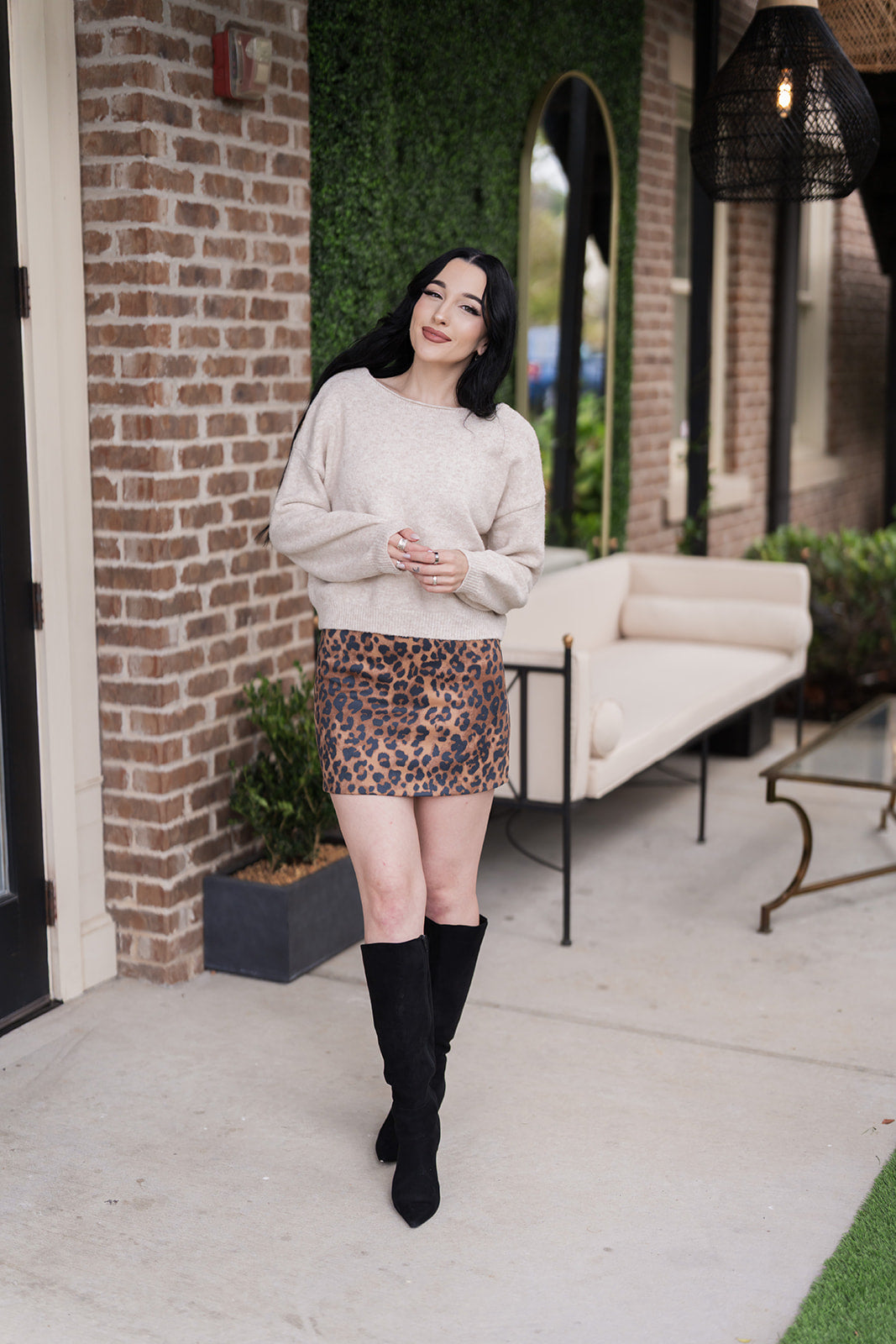 For a chic, classic look, pair the sweater with a black denim mini skirt and ankle boots.