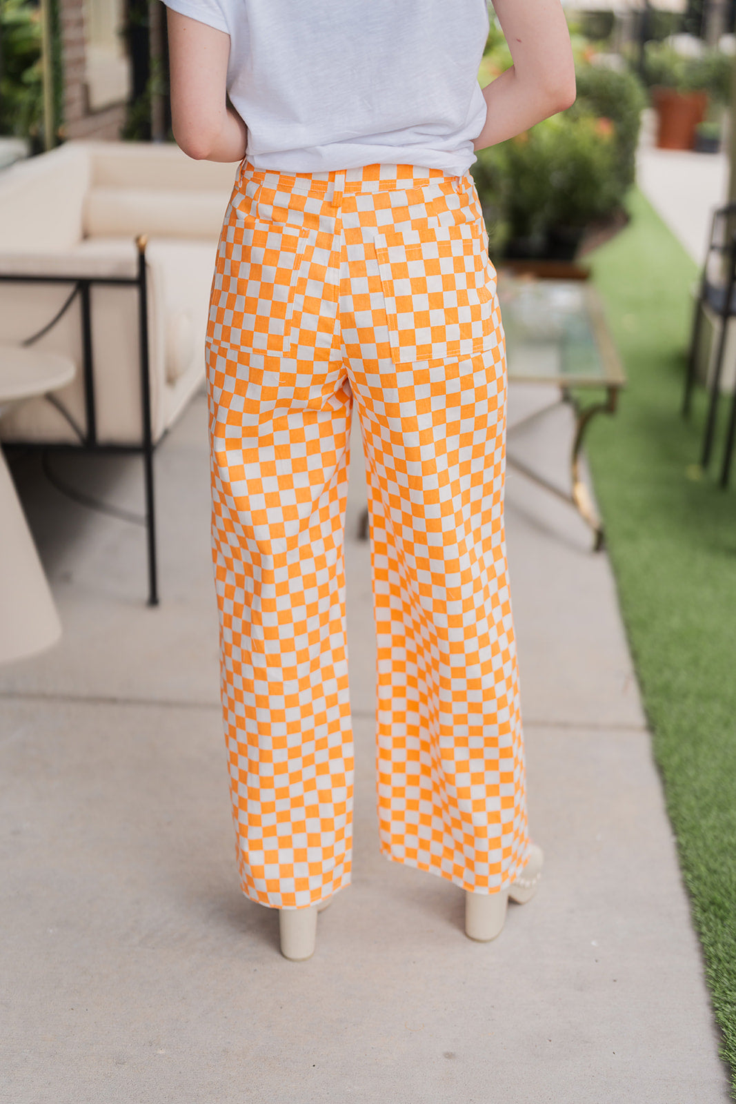 Capture a vibrant, energetic spirit with the Rocky Top Checker Pants, a statement piece that's as fun as it is stylish. These women's pants feature a bold, eye-catching orange and white checkerboard pattern that gives a playful, retro-inspired feel to your wardrobe. Crafted from a comfortable woven fabric, these pants are designed for both style and comfort. The high-waisted fit beautifully defines your figure and pairs seamlessly with a wide range of tops, making these trousers a versatile addition to any collection.