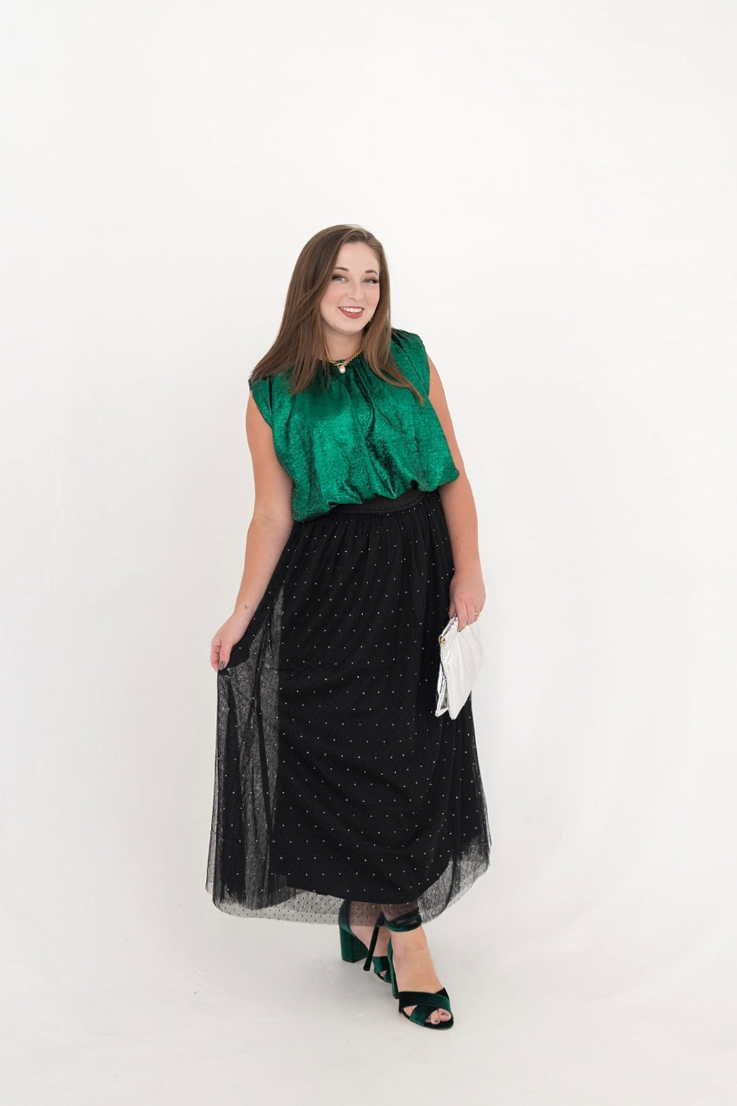 Pair the Starlight Tulle Midi Skirt with a fitted, soft knit cashmere or velvet bodysuit in a complementary color (like black, wine, or emerald green).