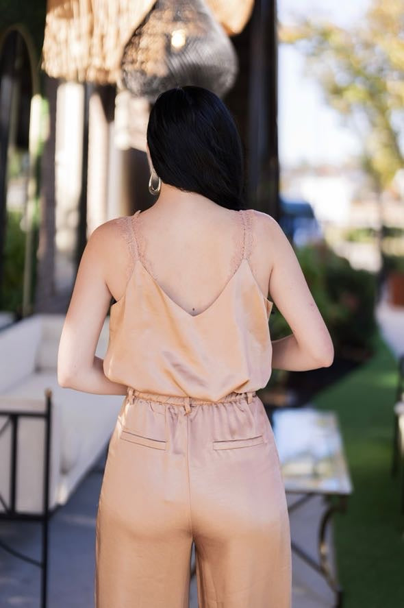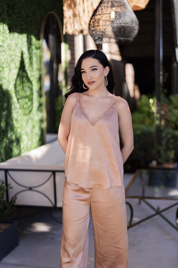 Step into a world of timeless glamour with The Velvet Hour Cami, a luxurious piece that perfectly complements your most sophisticated looks. This women’s top is crafted from a silky, satin-like fabric in a warm and versatile almond color, which feels incredibly soft against the skin and drapes beautifully. This camisole features a delicate lace trim that lines the V-neckline and straps, adding a touch of romantic elegance that is both classic and chic. The Velvet Hour Cami is designed to be the perfect foundational piece for your wardrobe, whether you're building a look from scratch or looking for the perfect finishing touch.