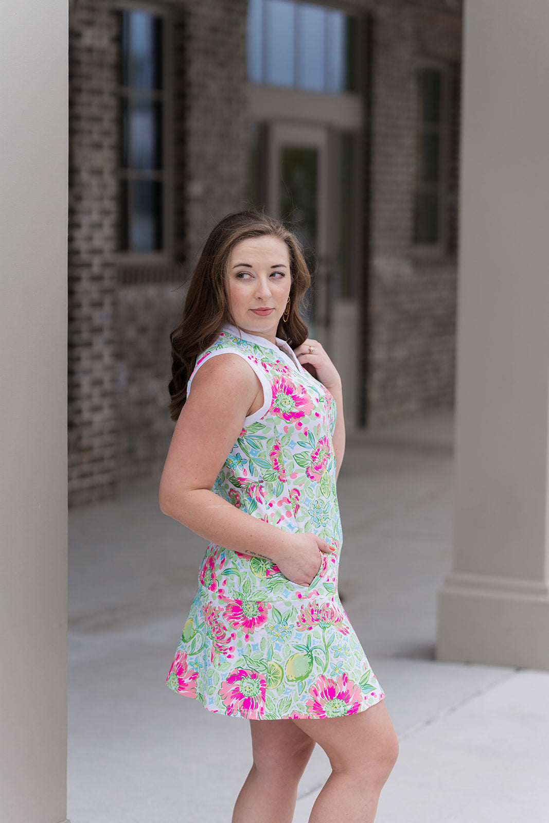 Embrace the vibrant energy of a tropical getaway with the Palm Beach Playdress. This stunning sleeveless piece is a masterclass in preppy resort wear, designed to take you from a morning on the golf course to an afternoon of boutique shopping in effortless style. Featuring a lush, hand-painted botanical print, the dress is adorned with blooming pink hibiscus, zesty lime slices, and verdant green leaves set against a crisp, multi-tonal trellis background. It’s a visual celebration of the Florida coastline, capturing the sunshine and sophistication of a high-end social club.