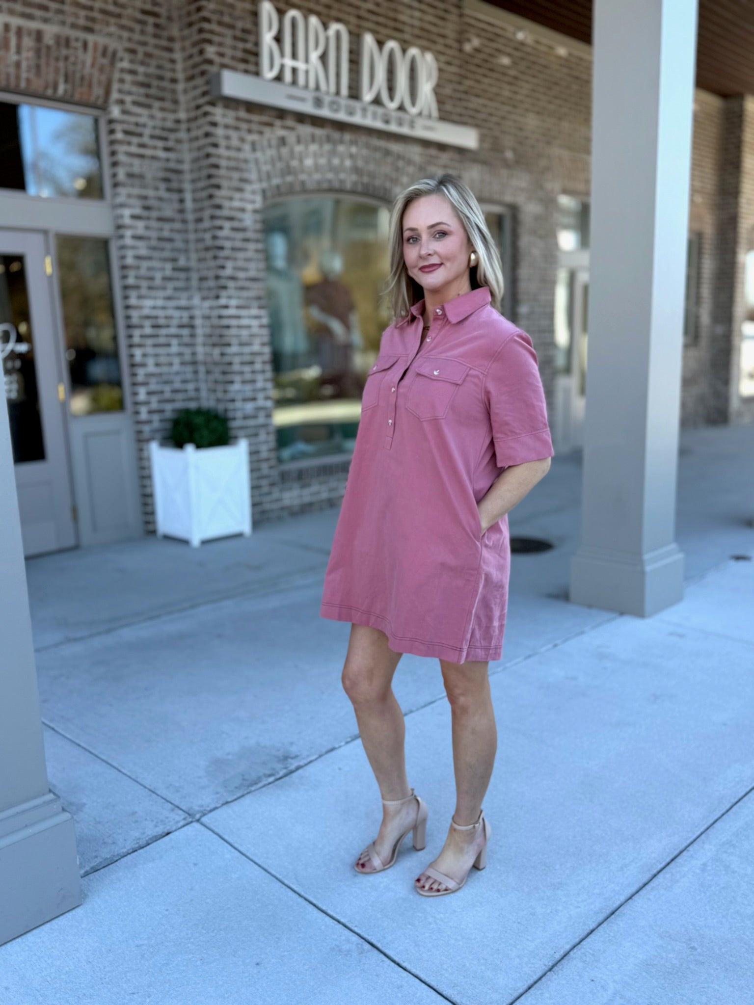 The Dusty Rose Detail Mini is crafted for the woman who values both style and practicality. The half-length sleeves offer elegant coverage, while the crisp collar and partial button-down placket provide a polished, professional touch. The relaxed H-line fit ensures a comfortable, airy feel that skims the body without restricting movement, making it your go-to choice for busy workdays or weekend gallery hops. Perhaps the most coveted feature is the inclusion of discreet side pockets and functional front chest pockets with button closures, allowing you to move through your day completely hands-free. Whether you're dressing it up for a luncheon or keeping it casual for a coffee date, this dress exudes a refined, boutique-inspired aesthetic that never goes out of style.