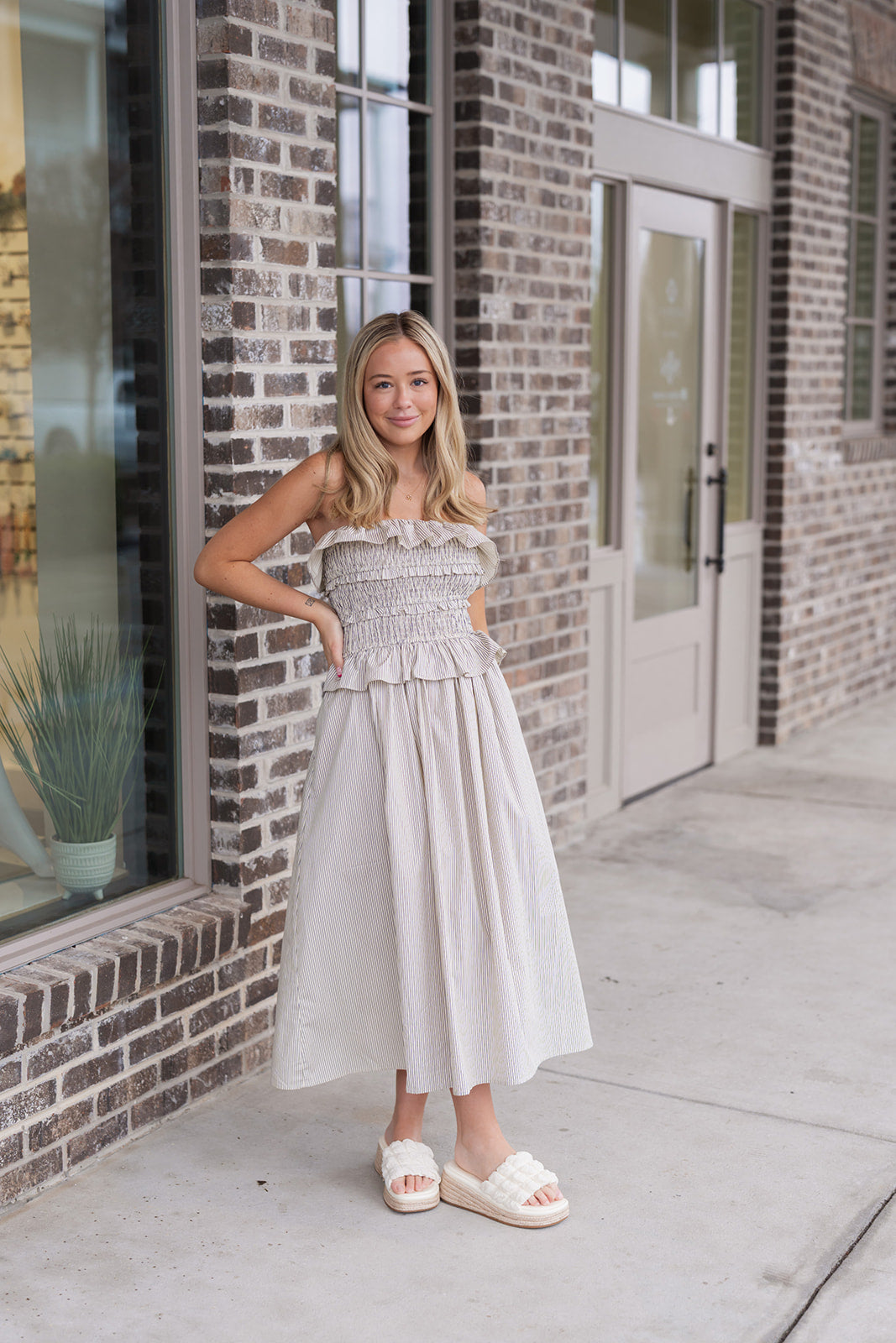 The design centers around a beautifully textured smocked bodice that provides a flexible, secure fit for all-day wear. This elasticized section is further elevated by delicate, layered ruffle trims at both the neckline and the waist, adding a playful and flirty dimension to the structured stripes. Crafted from a lightweight cotton blend, the fabric offers a crisp yet soft hand-feel that breathes naturally with your body. The bodice flows seamlessly into a voluminous A-line midi skirt that dances with every step, providing a sense of freedom and movement. With its clean lines and charming details, this dress is a "one-and-done" boutique essential that perfectly captures the spirit of warm-weather sophistication.