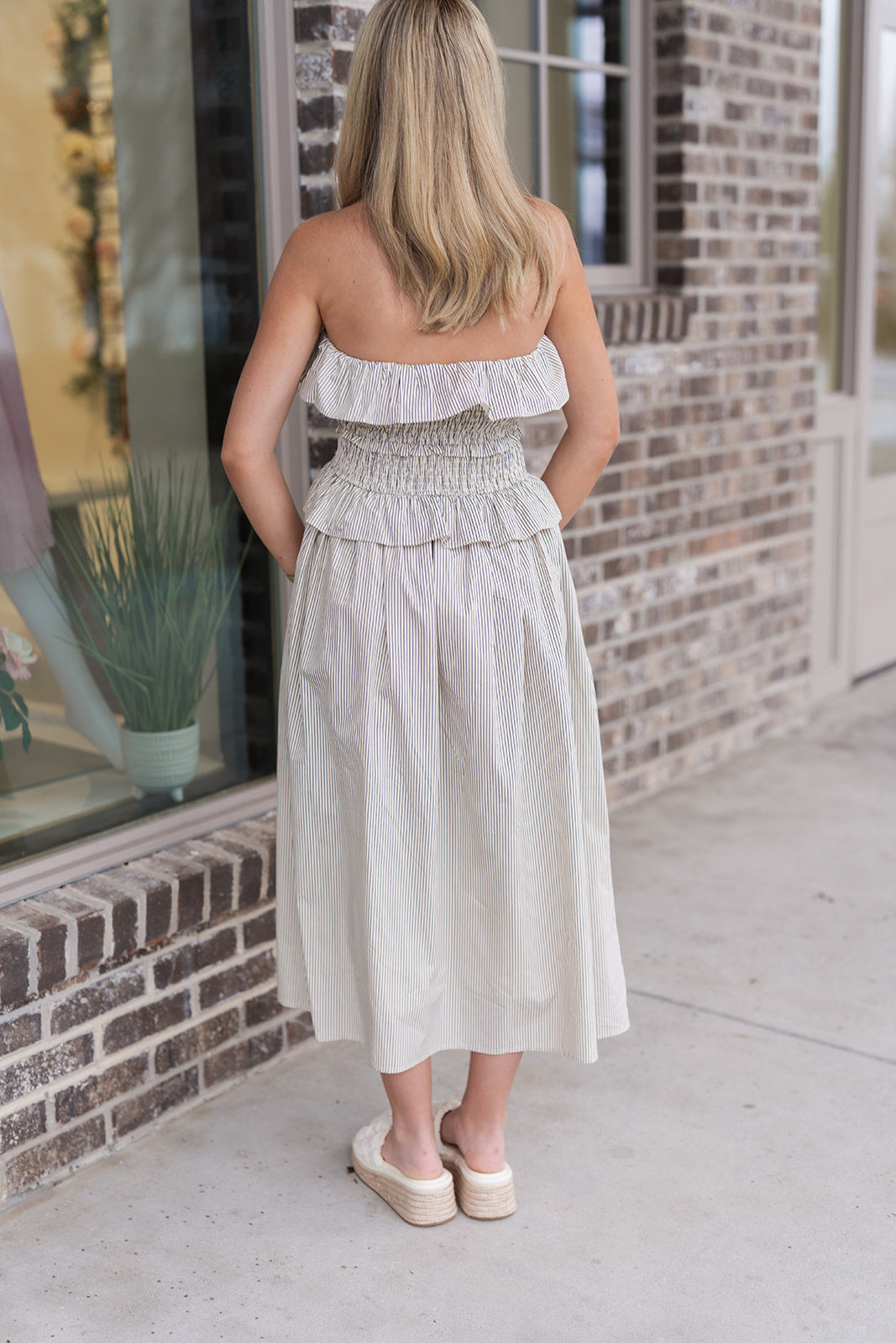 For a quintessential summer look, pair the Sunlit Stripe Midi Dress with flat leather slides and a wide-brimmed straw hat. This creates a relaxed, beach-ready aesthetic that is perfect for vacation or a casual afternoon outing. To highlight the strapless neckline, add a dainty gold pendant necklace or a set of bold gold hoop earrings.