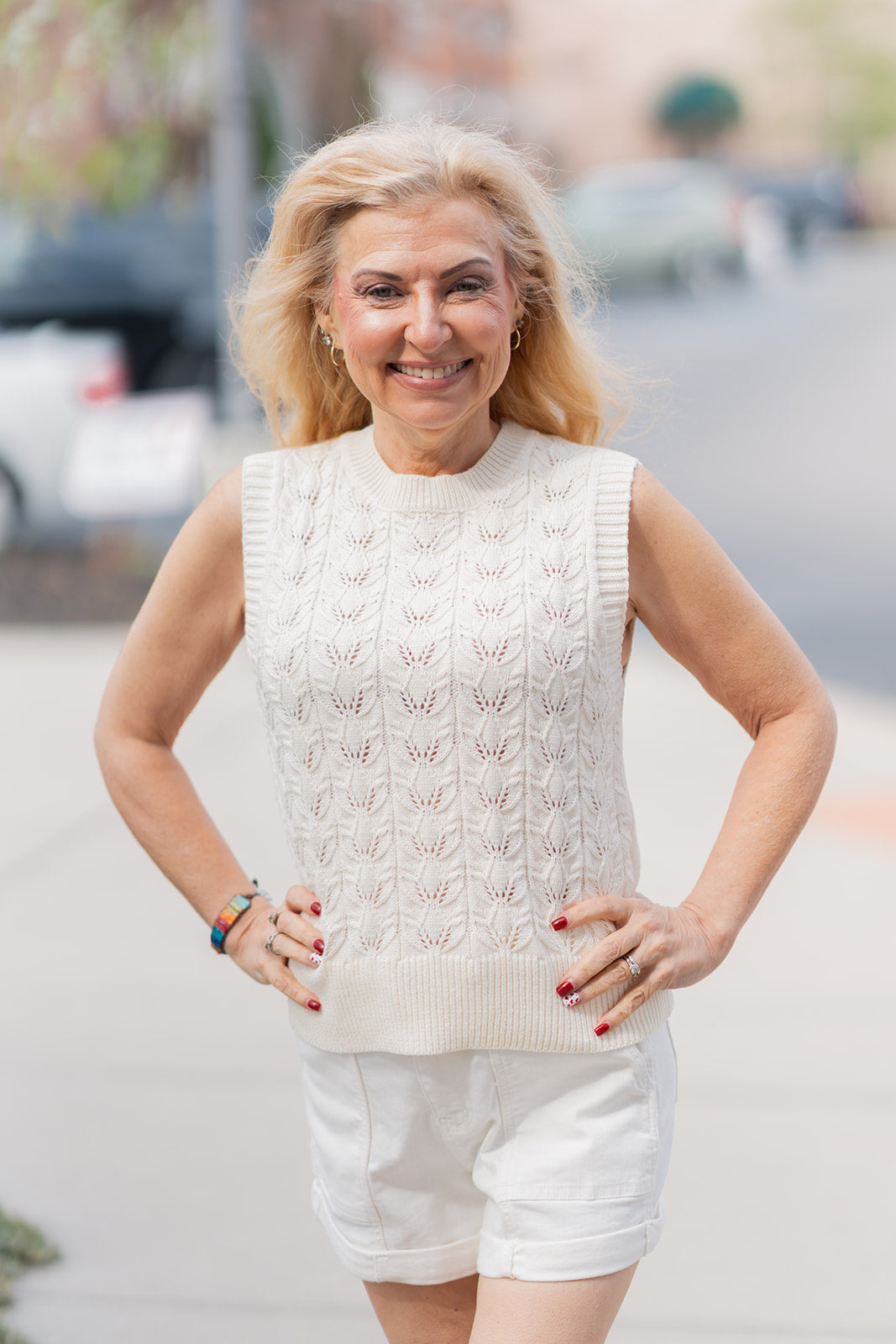 • Ethereal Elegance: Layer the Heirloom Petal Vest over a crisp white eyelet-embroidered midi skirt (as seen in the photo) and finish with a pearl bracelet for a soft, monochromatic romantic look.