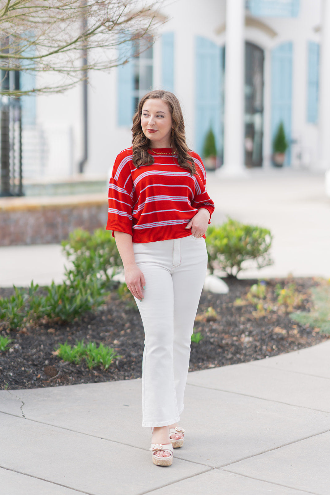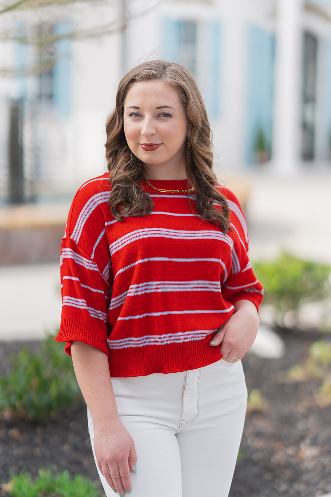 Infuse your daily wardrobe with a splash of nautical charm and modern flair with the Marina Morning Ribbed Top. This eye-catching piece features a bold, vibrant red base accented by crisp, light blue horizontal stripes, creating a look that is both classic and contemporary. Designed for the woman who values both comfort and a polished aesthetic, this top is the ultimate transitional staple. The medium-weight knit provides a substantial, high-quality feel that holds its shape beautifully while remaining breathable enough for a sun-drenched morning by the coast or a casual afternoon in the city.