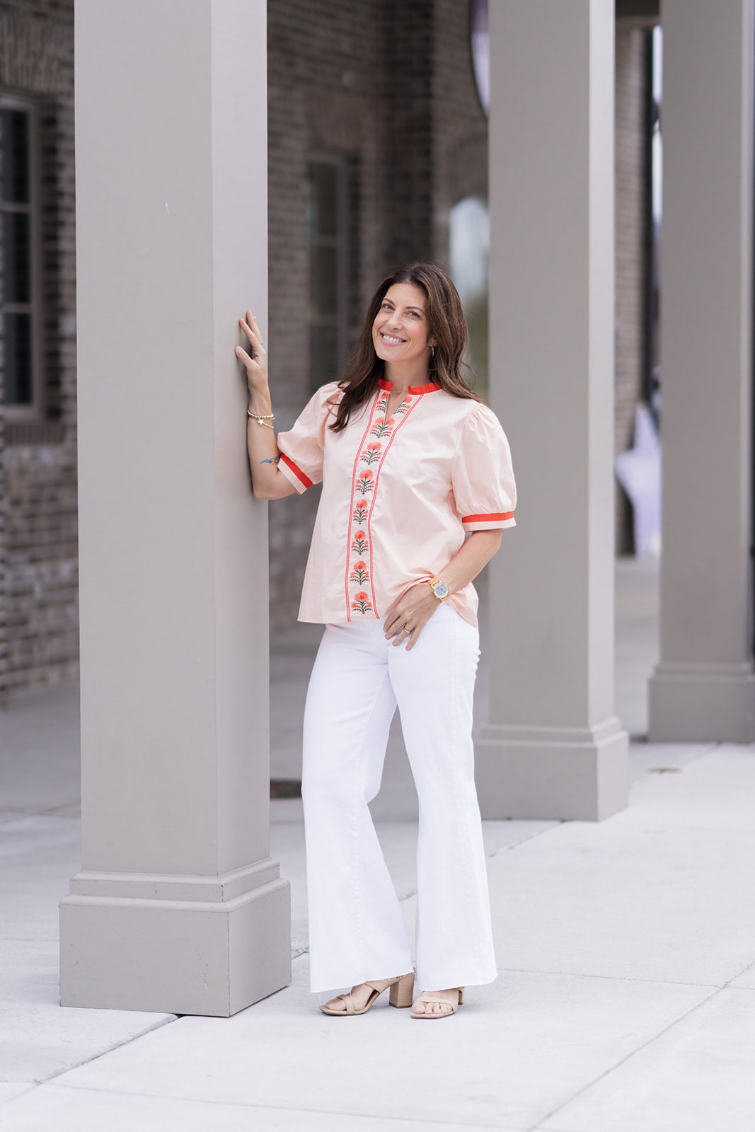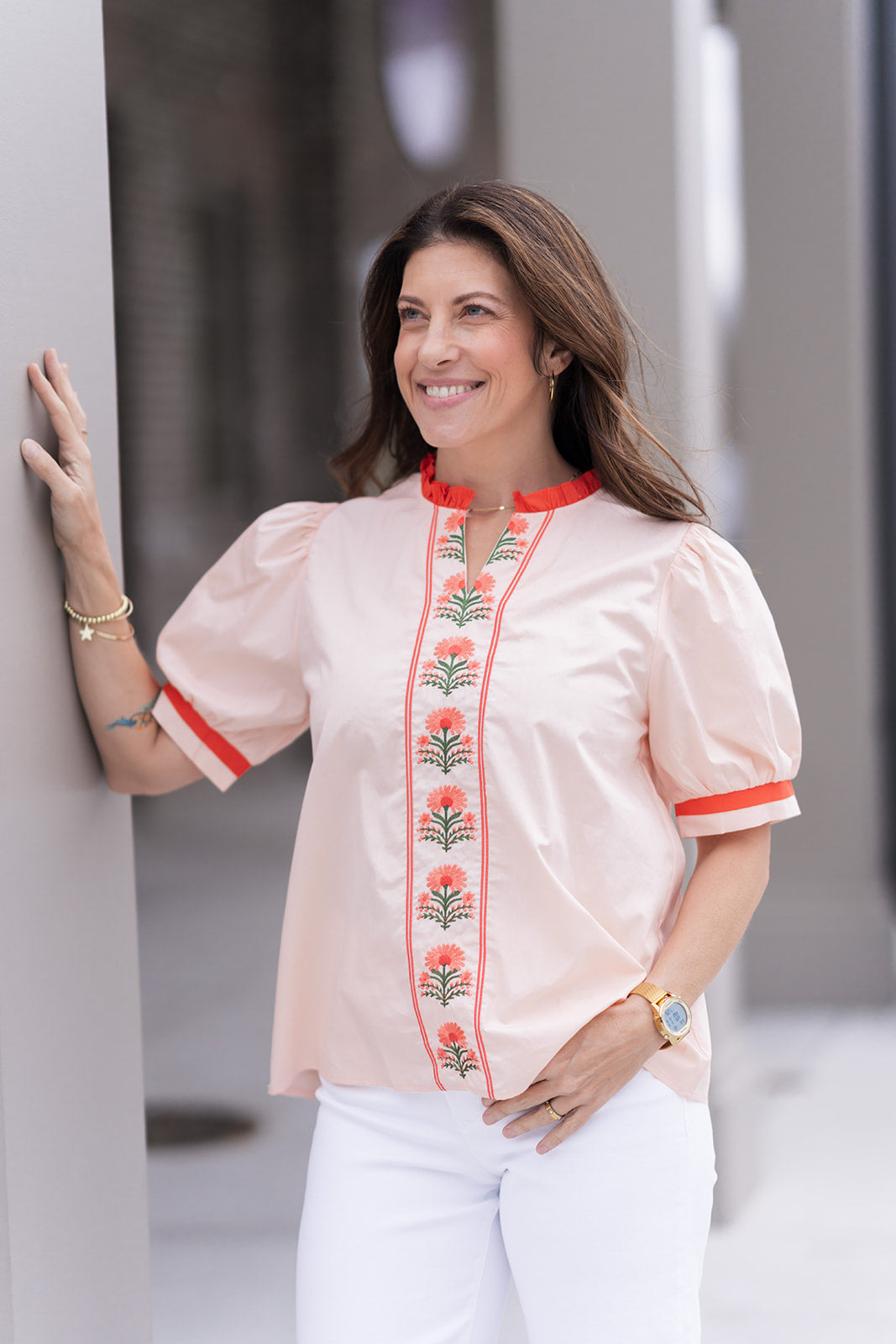 The Palm Beach Patio Top is crafted from a premium, lightweight fabric in a soft Beige hue that serves as a warm, versatile neutral. The design features a sophisticated notched V-neckline framed by a whimsical red ruffled collar, adding a touch of vintage-inspired femininity to the silhouette. The true centerpiece of the garment is the stunning vertical floral embroidery cascading down the center front; rendered in vibrant shades of coral-orange and lush green, this artisanal detail provides a beautiful, symmetrical focus. The short puff sleeves are finished with matching red contrast bands at the cuffs, echoing the collar's detail and providing a structured, modern shape. Whether you're heading to a resort getaway or simply enjoying a weekend in the sun, this top offers a refined, "boutique" feel that celebrates the joyful essence of the season.