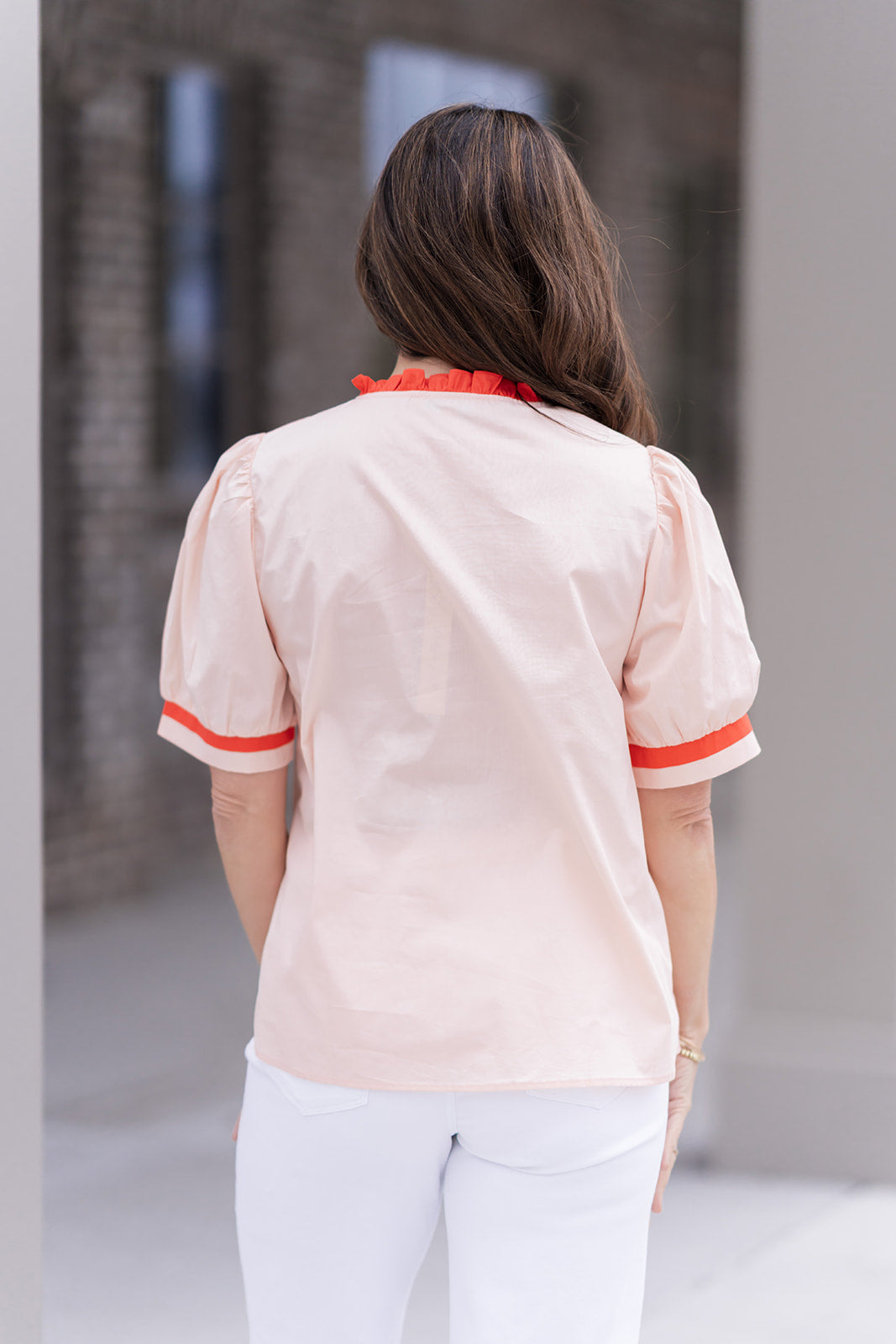 Sleeves: Elegant puff-sleeve construction for a structured yet soft shoulder line.
