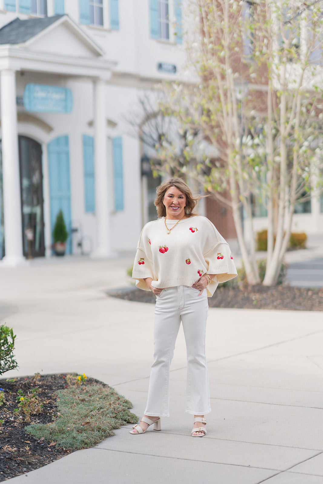 For a quintessential spring look, pair the Very Berry Harvest Knit Top with high-waisted light wash denim (as shown) and a pair of clean white sneakers. The red tones in the embroidery pop beautifully against blue denim, creating a classic Americano vibe.