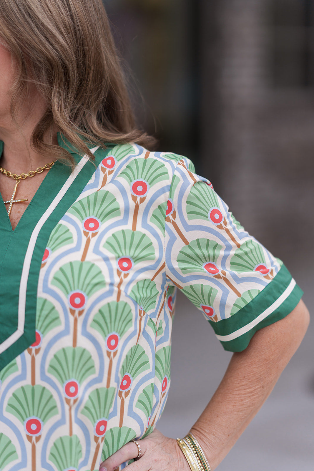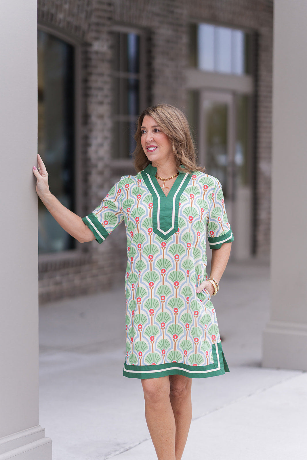 The silhouette is thoughtfully designed to provide a structured yet comfortable fit that flatters every figure. The v-neckline is accentuated by a bold, contrasting green and cream border that draws the eye upward, while the short sleeves and relaxed H-line cut offer a modern take on the classic shift dress. Whether you're attending a garden party or exploring a coastal town, the Palm Springs Patio Dress ensures you look polished and feel cool. Crafted from a high-quality, lightweight fabric, it moves beautifully and maintains its shape throughout the day. Plus, the inclusion of discreet side pockets adds a functional touch to this high-fashion piece, allowing you to keep your essentials close at hand while maintaining a sleek profile.
