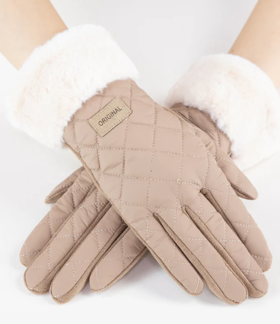 The body of the glove features a classic quilted texture in a stylish diamond pattern, giving them a padded, puffer-coat look that is both on-trend and insulating. The cuff is generously trimmed with plush faux fur, adding an element of high-end, cozy glamour and ensuring an extra layer of warmth around the wrist. A small "ORIGINAL" logo detail on the back of the hand provides a subtle designer touch.