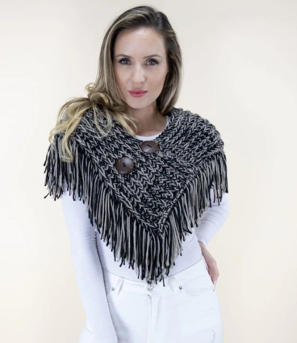 Adding to its rustic charm are two oversized, dark wooden buttons that secure the cape with a simple overlap closure. This detail not only provides a lovely fashion accessory accent but also ensures the shawl stays perfectly in place, unlike a traditional scarf. The edges are finished with a playful, lengthy fringe detail that enhances the cozy, handcrafted appeal.