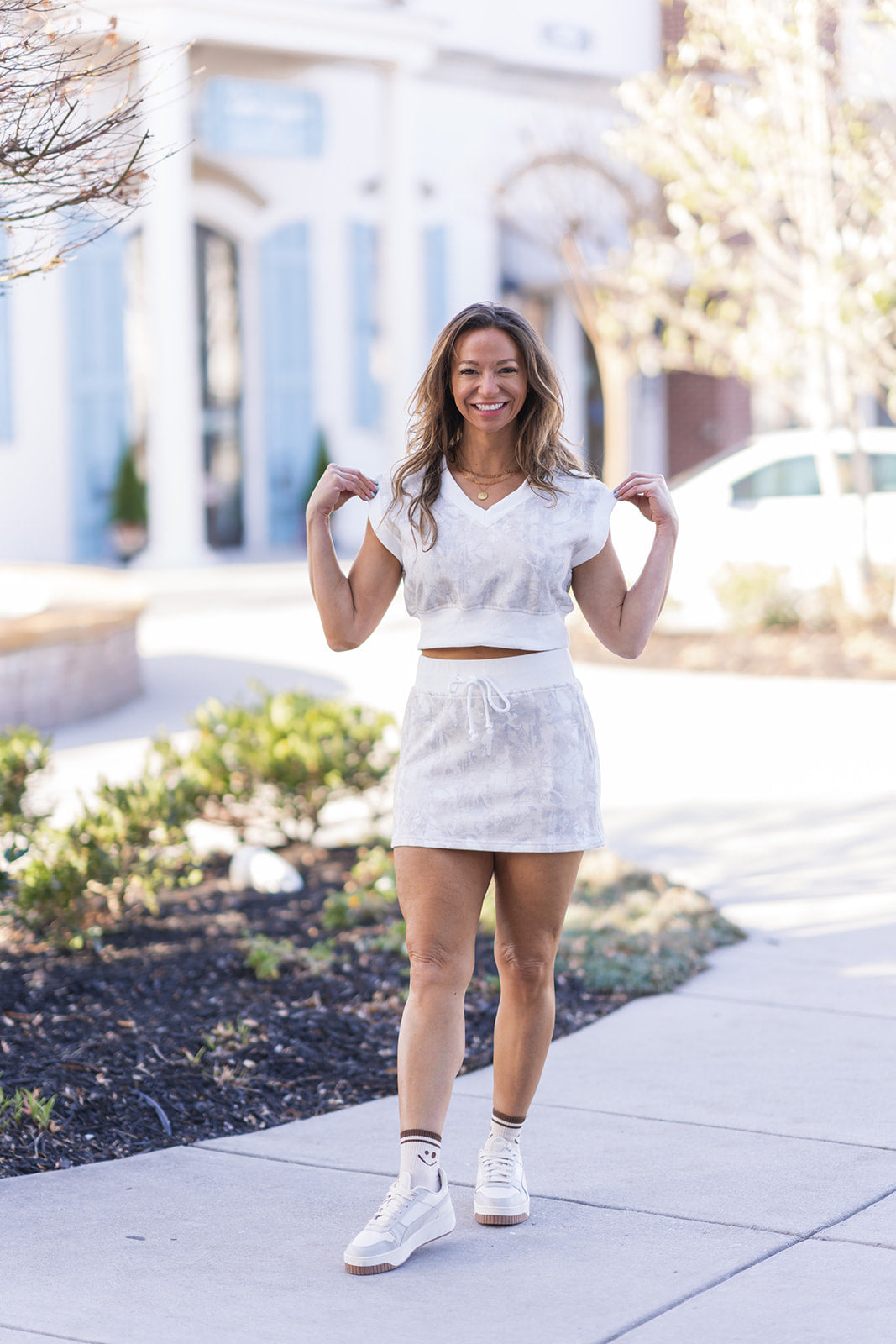 For a chic travel look, pair the Frosted Haze Set with chunky white sneakers, a denim jacket draped over your shoulders, and a sleek leather backpack. If you're heading out for weekend errands, swap the jacket for an oversized cardigan and add some gold hoop earrings to elevate the vibe. To transition this set into a casual lunch date, tuck the top in slightly, add a pair of tan platform slides, and finish the look with a pair of oversized wire-frame glasses and a messy bun.
