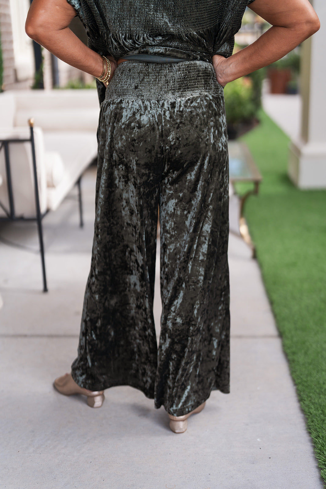 Designed with both aesthetics and practicality in mind, these pants feature a wide smocked elastic waist that ensures a perfect, flattering fit for a variety of body types. The flowing wide-leg silhouette creates beautiful movement and a graceful line, elongating your frame and making a subtle yet powerful style statement. Functional side pockets are seamlessly integrated into the design, allowing you to carry small essentials without compromising the sleek look. Whether you're dressing for a festive holiday party or a relaxed weekend outing, the Olive Grove Pants provide a foundation of effortless chic that can be dressed up or down with ease. Embrace the season in style and comfort with these must-have velvet trousers.