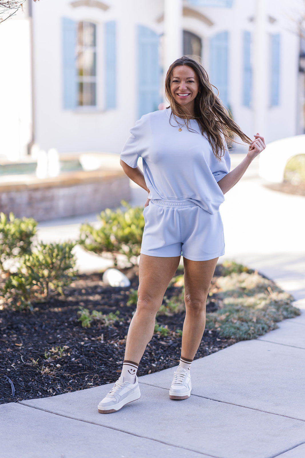 Discover effortless elegance with the Sweet Escape Lounge Set—your new essential for relaxed, everyday comfort. Crafted from our signature sand-washed scuba fabric, this coordinated tee and short pairing delivers a buttery-soft, spongy hand feel that feels as luxurious as it looks. The relaxed drop-shoulder silhouette and gently cropped fit create a modern, understated aesthetic, while functional side pockets and an elastic waistband ensure practicality without compromise. Perfect for transitioning from home to errands, this versatile set embodies the timeless, premium comfort your wardrobe deserves.