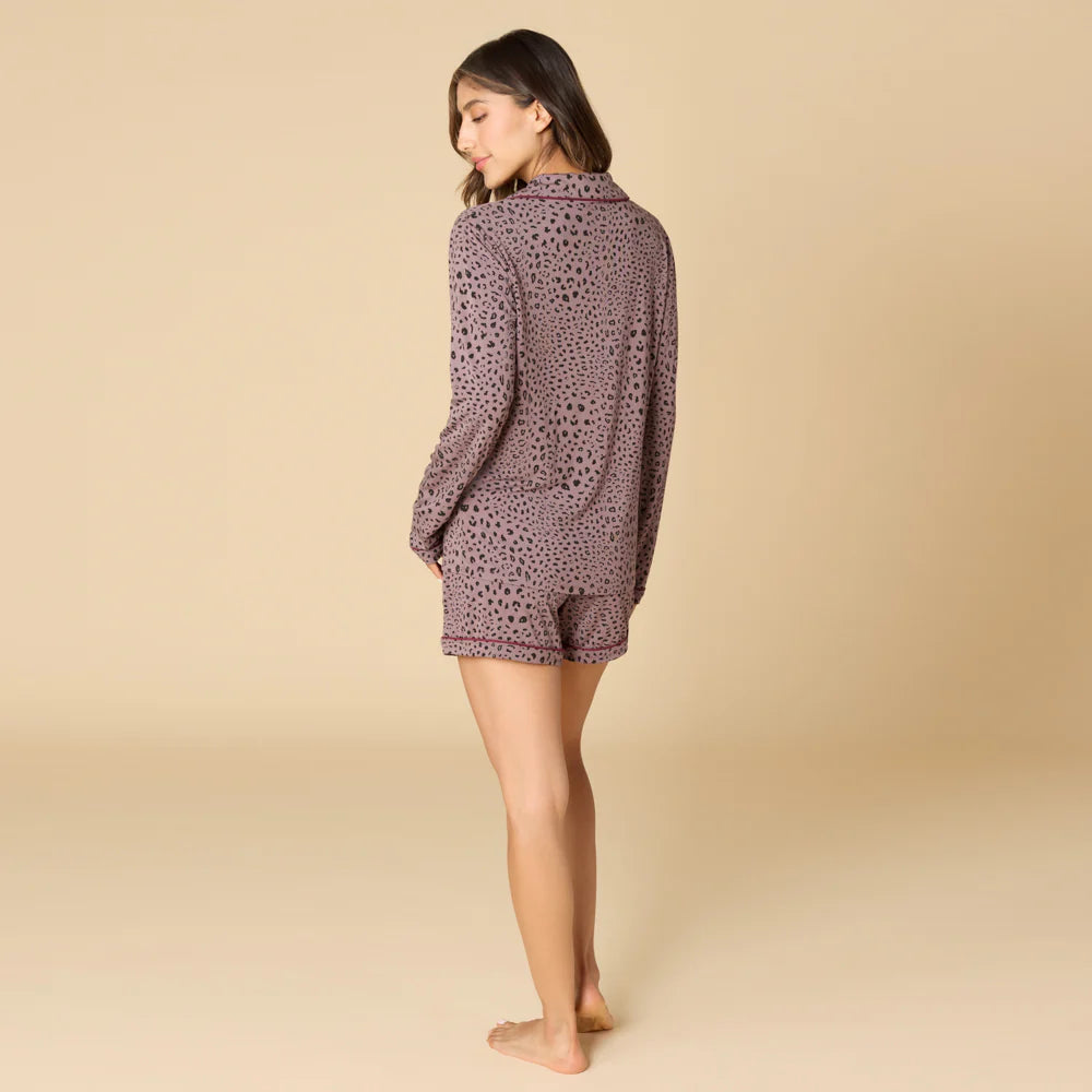 Indulge in cozy elegance with the Aria Slim Notch Collar Long Sleeve Short PJ Set, the perfect addition to your loungewear collection. This stylish set is crafted from an incredibly soft, brushed jersey knit fabric, ensuring luxurious comfort whether you're relaxing at home or drifting off to sleep. The specific color shown, Wild Driftwood, is a unique blend of muted purples and dusty rose, featuring a sophisticated, subtle leopard print that elevates the classic pajama style. This set is designed to make your nights as chic as your days, offering a relaxed fit that's both flattering and supremely comfortable.