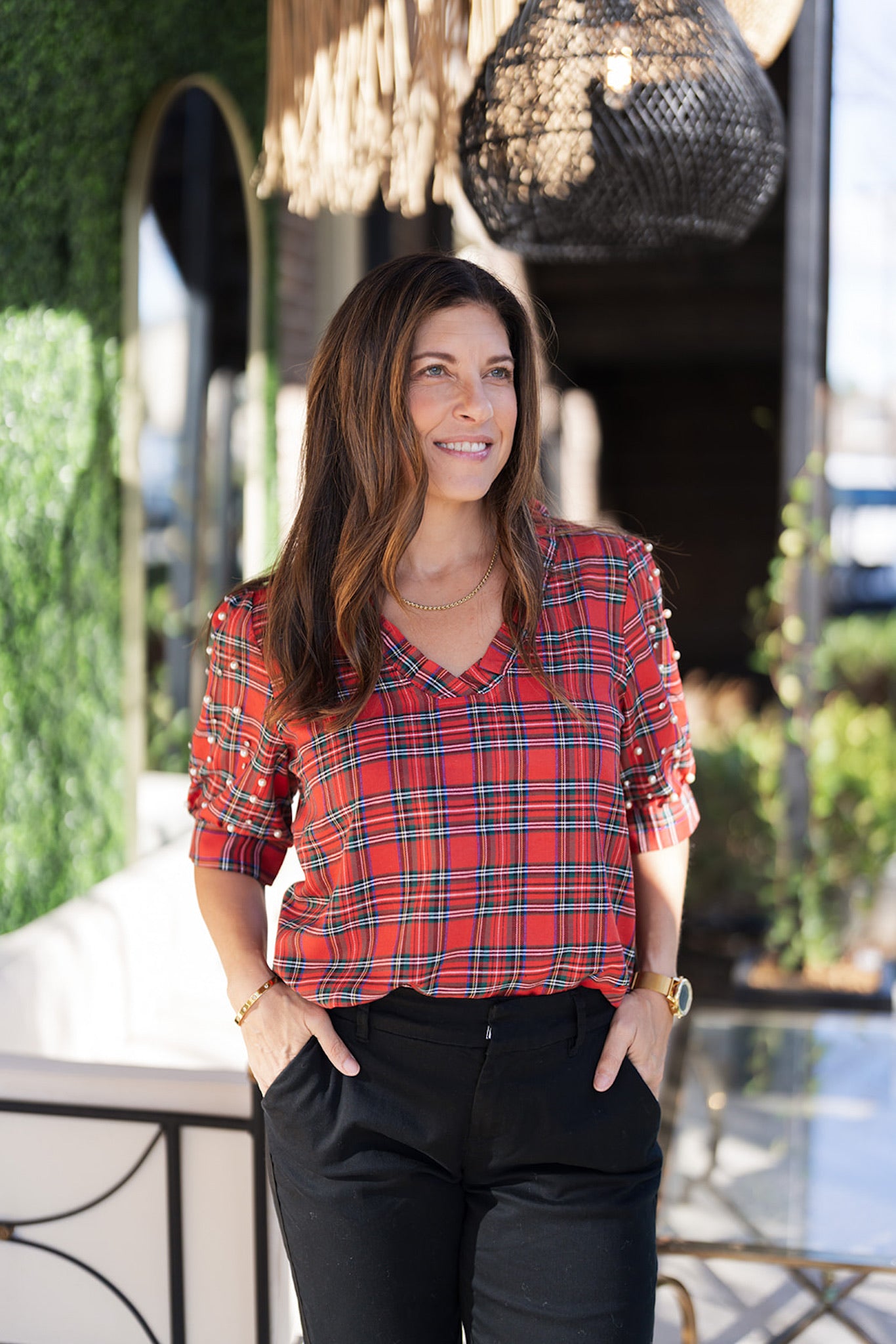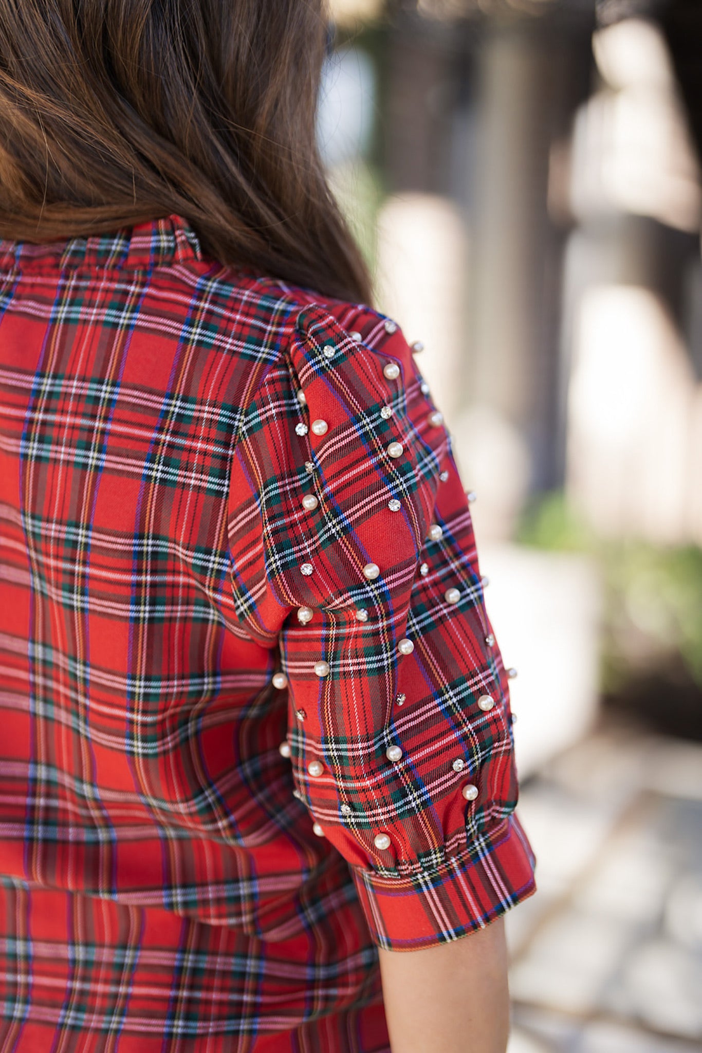 christmas plaid beaded sleeves ruffled v neck top