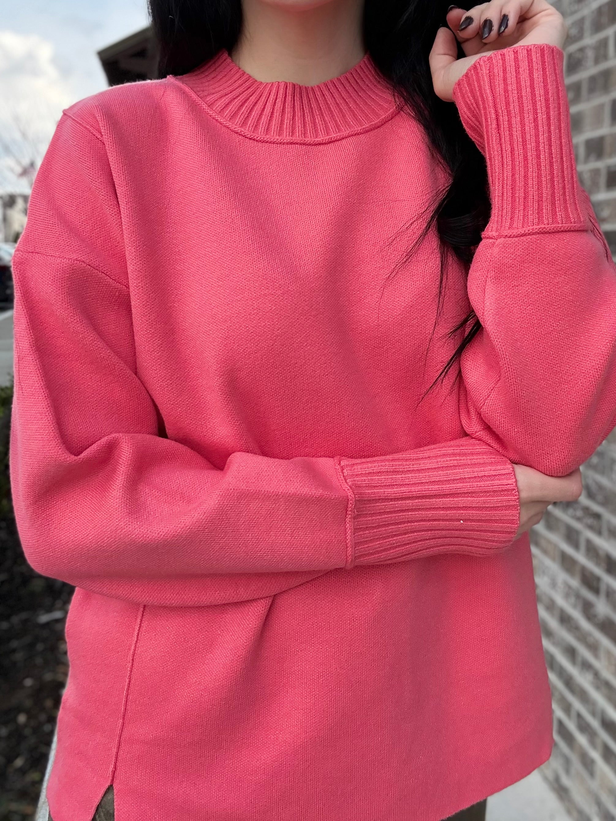 The Coral Reef Pullover is designed for comfortable, modern wear. It features a slightly structured mock neck/crew neckline and a relaxed, easy silhouette through the body. The ribbed knit detail is featured on the tall cuffs and hem, which contrasts subtly with the smoother knit body. The stylish side slits at the hem add a contemporary touch and ensure comfortable movement. Its vibrant color and cozy feel make it an ideal throw-on-and-go piece for effortless style.