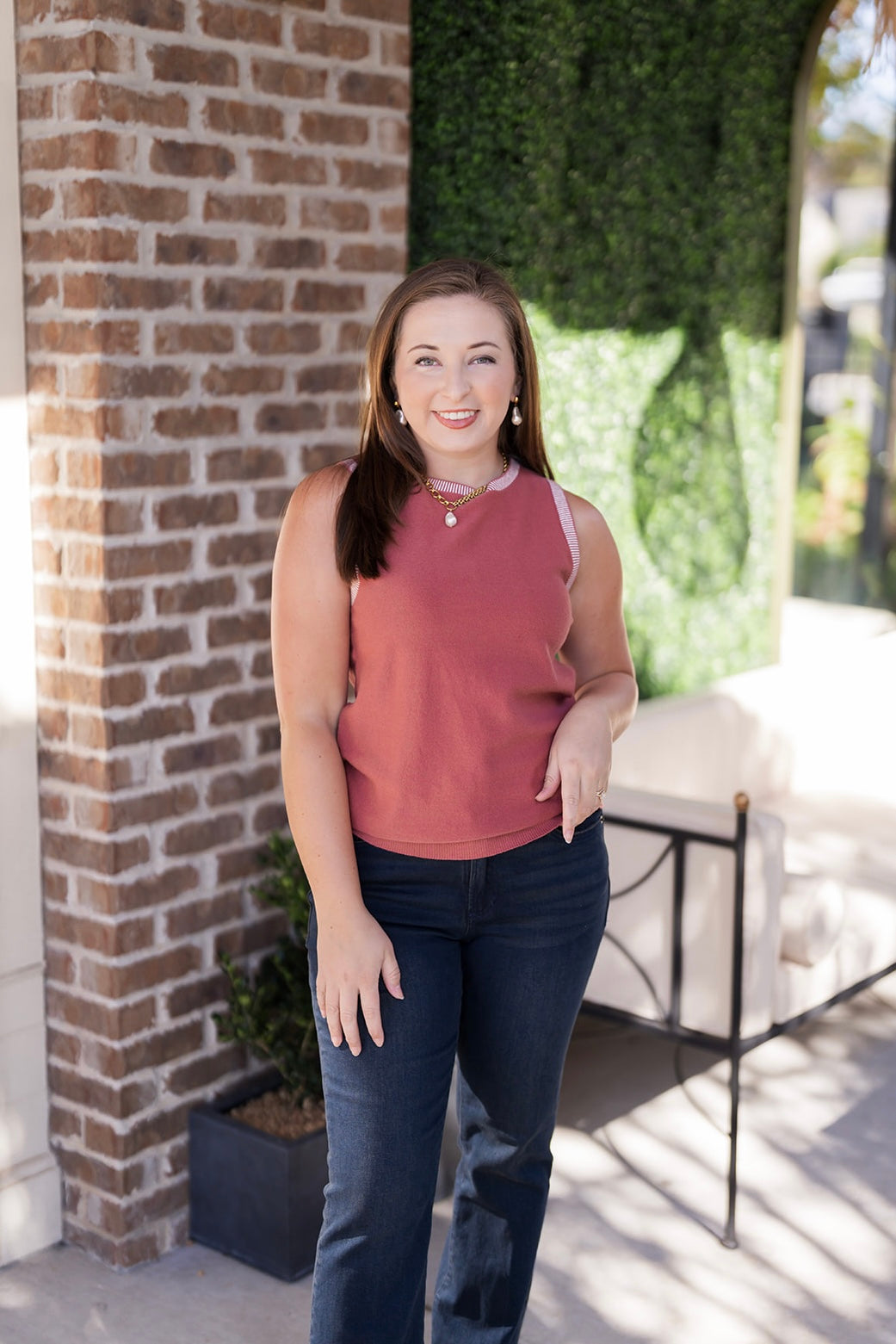 The Sunset Coast Knit Tank is an essential for any sophisticated, casual wardrobe. It features a classic crewneck and comfortable, slightly extended shoulders, offering a relaxed fit that is easy to wear all day long. The classic ribbed trim on the neckline in a contrasting coral color adds a final touch of polish. This tank is perfect for wearing on its own during warmer weather or layering under a light jacket. Its distinctive color-blocking makes it a versatile statement piece.
