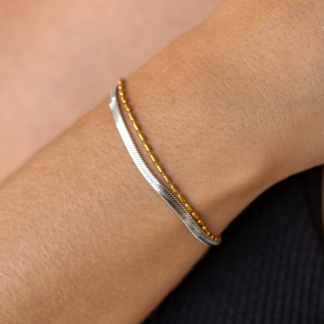 The Essence Bracelet is a must-have accessory for any jewelry lover. Crafted with 18K gold plating and stainless steel, it's not only stylish but also nickel-free, lead-free, and hypoallergenic for sensitive skin. With its 2-in-1 design and adjustable 6" length plus 2" extender, it offers versatility and a perfect fit. And don't worry about taking it off, as it is water resistant. Elevate your look and confidence with the Essence Bracelet!