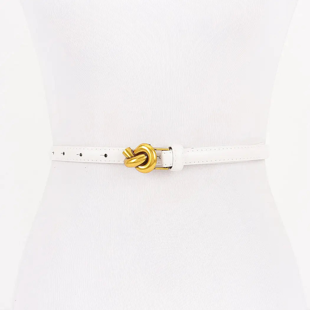Crafted from high-quality, smooth faux leather (polyurethane), this belt features a dainty 0.5" width that is ideal for weaving through standard belt loops or cinching over delicate fabrics. The true star of the piece is the distinctive intertwined metal loop buckle. Finished in a rich, brushed gold tone, the buckle features a sculptural "knot" design that symbolizes strength and timeless style. Whether you choose the classic, deep Black for a sharp contrast or the crisp, ethereal White for a fresh seasonal look, this belt provides a luxurious feel that elevates everything from basic denim to high-fashion silhouettes.
