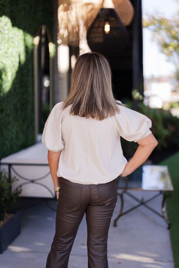 Feminine Contrast: The voluminous puff sleeves add a romantic and graceful touch that balances the casual, sporty neckline, making it incredibly versatile.