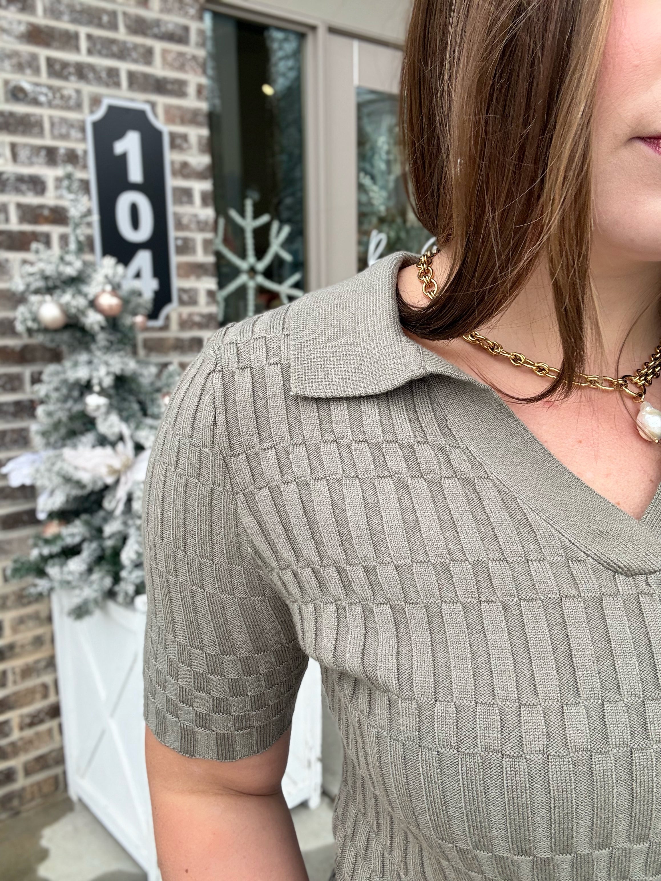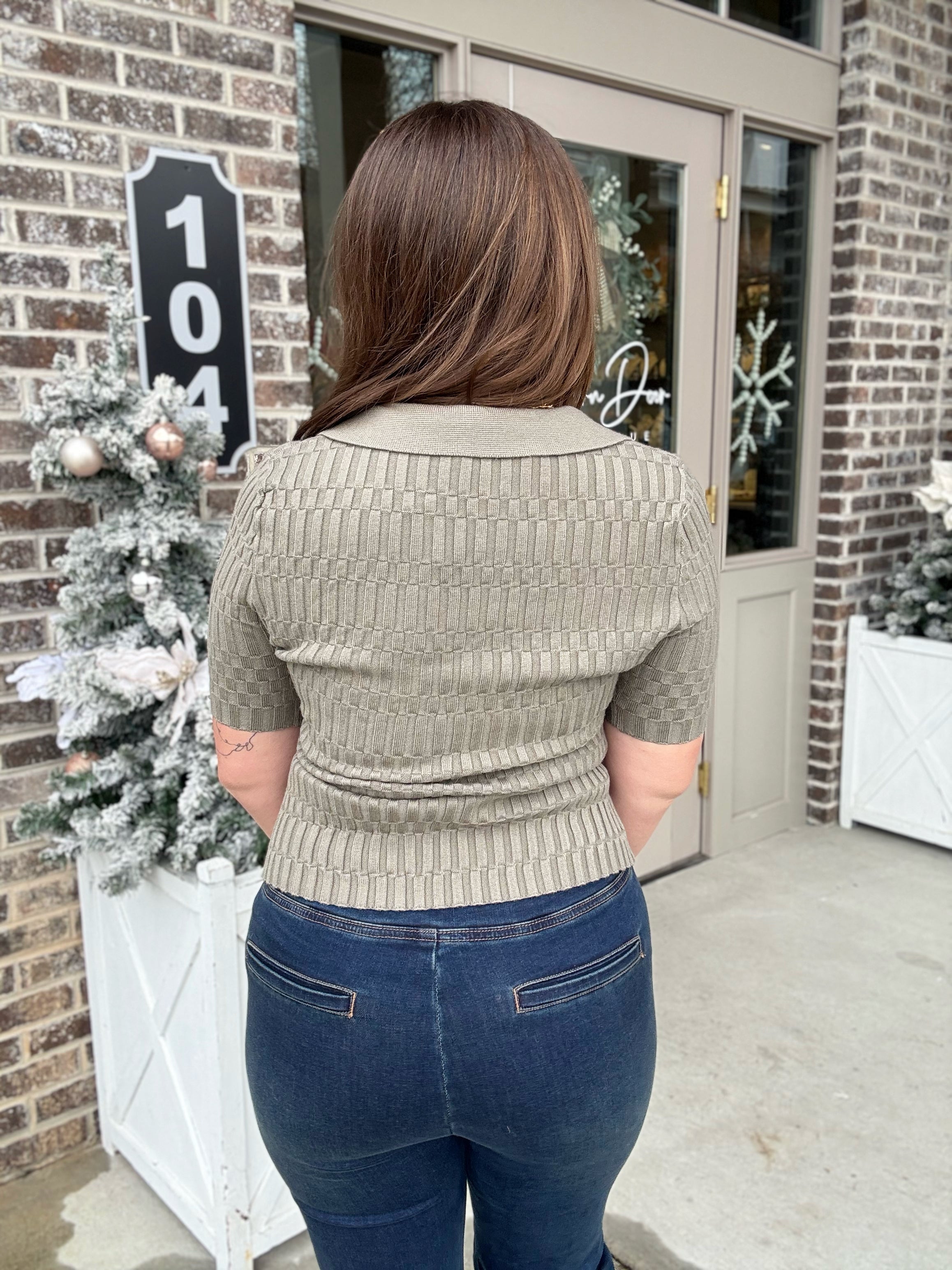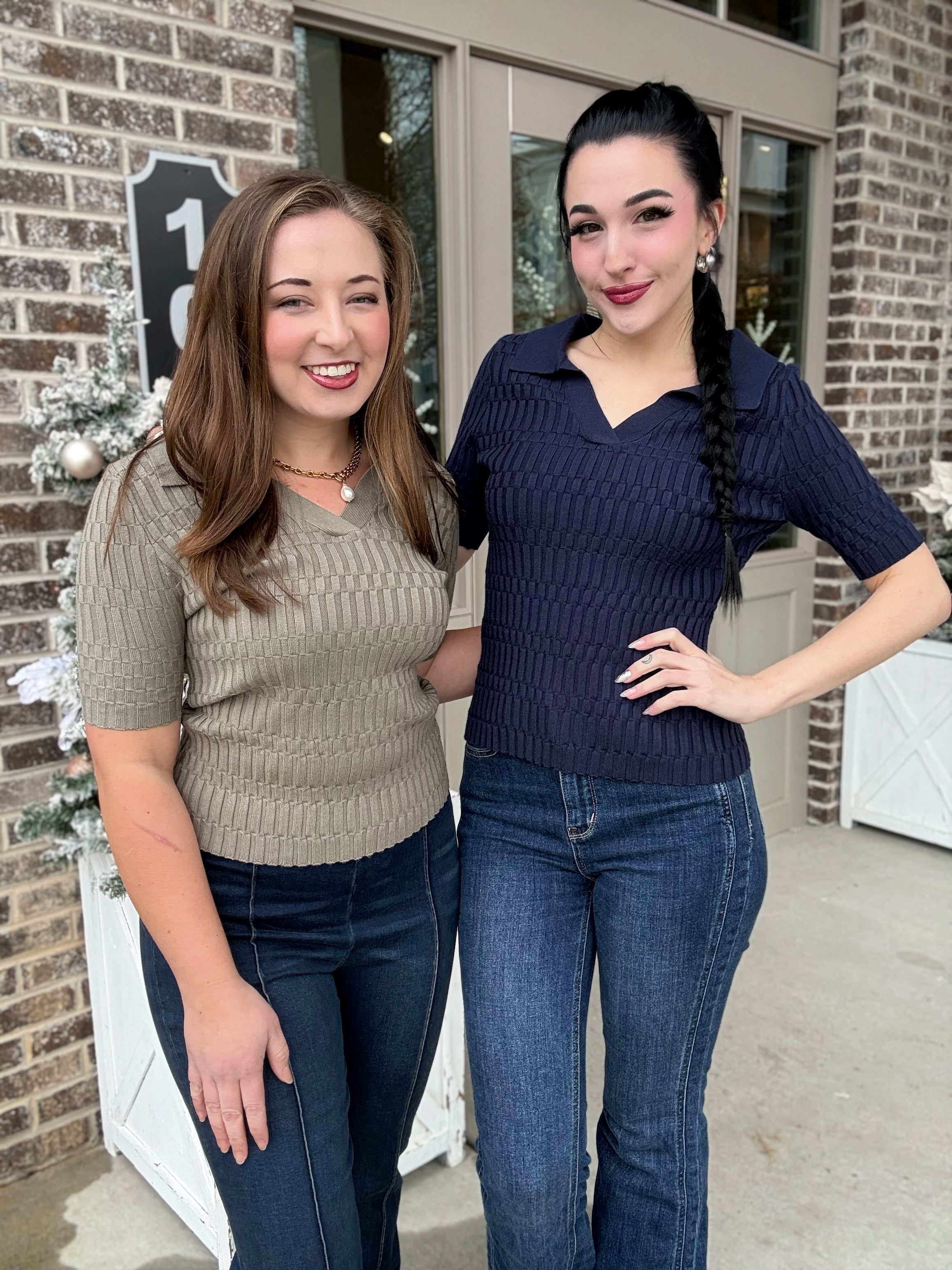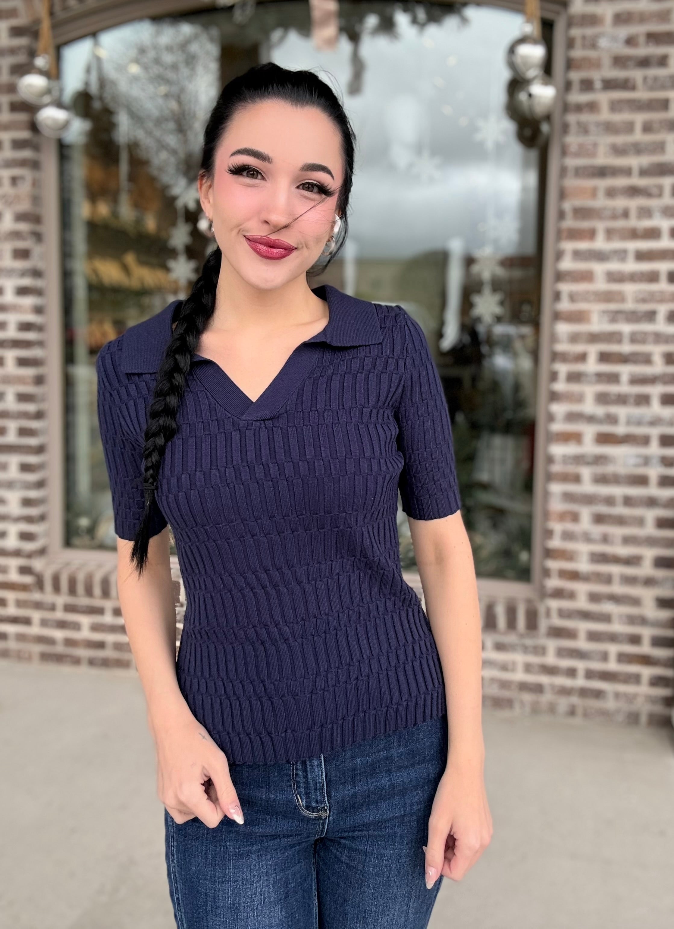 Inject a dose of refined athleticism into your wardrobe with The Grand Prix Polo, a women's top that flawlessly combines preppy style with a unique, luxurious texture. This top is crafted from a soft, fine-gauge knit featuring a distinctive geometric rib pattern that adds depth and modern flair to the fabric. Available in two versatile, rich colors—a deep Navy and an earthy Olive—this top is a comfortable and chic foundation for countless outfits.