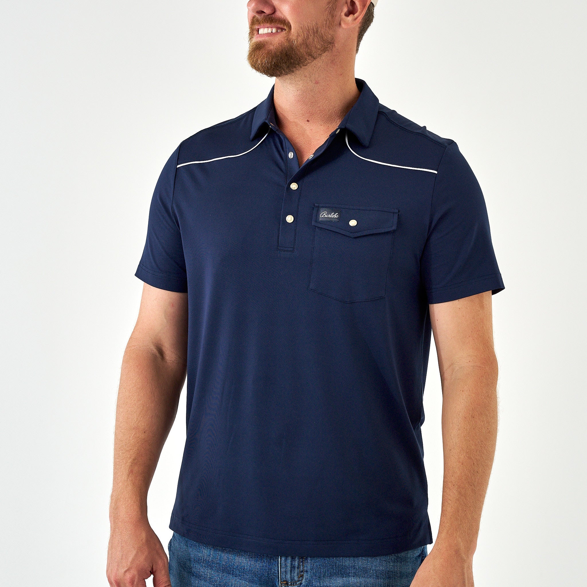 For a classic Southern look, pair the Heritage Pearl Snap Polo with dark-wash denim and your favorite leather cowboy boots. The navy and white accents pop beautifully against deep indigo jeans, creating a look that is both rugged and refined.