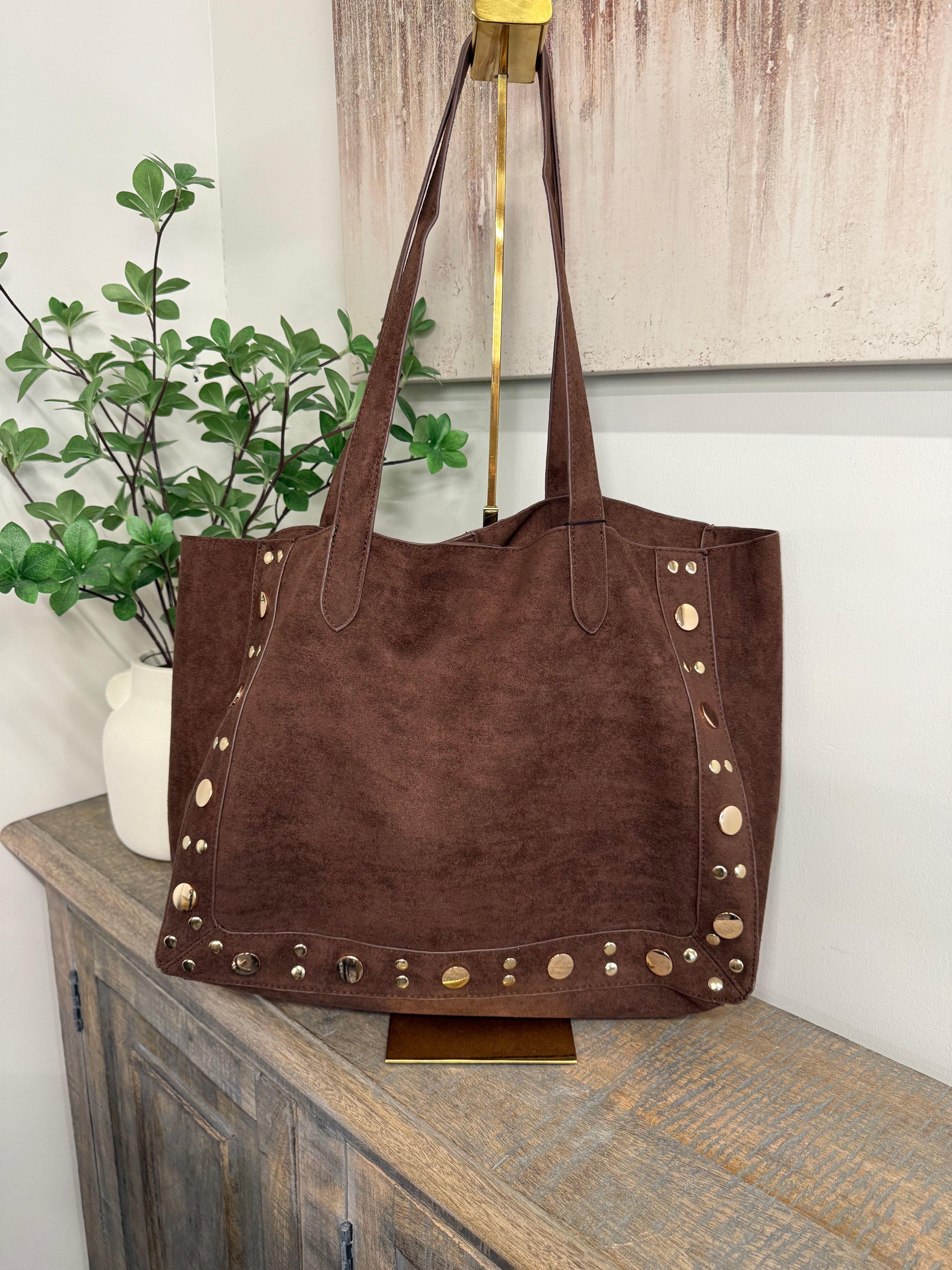 The Manhattan Studded Faux Suede Tote is fantastic for adding a polished edge to casual looks. For a weekend outfit, pair the Taupe tote with distressed black skinny jeans, a fitted white t-shirt, a soft leather jacket (or faux leather), and studded ankle boots. The taupe color prevents the look from feeling too heavy and adds a refined touch.