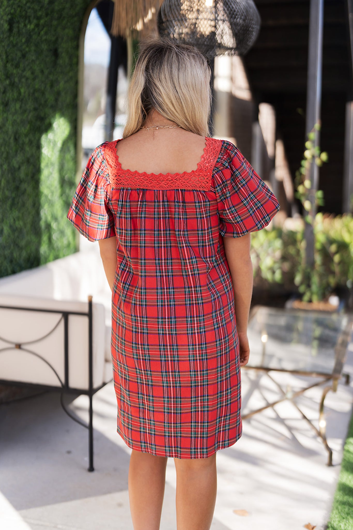 The Mistletoe Manor Mini Dress is thoughtfully detailed for a romantic, flattering silhouette. It features a broad, square neckline accented by delicate red lace trim and cinched by a beautiful green velvet ribbon tie at the center. Dramatic puffed short sleeves add voluminous flair, while the relaxed, flowing mini silhouette offers comfortable movement. The combination of the bold tartan, soft lace, and velvet ribbon ensures this dress is the epitome of holiday romance and fun.