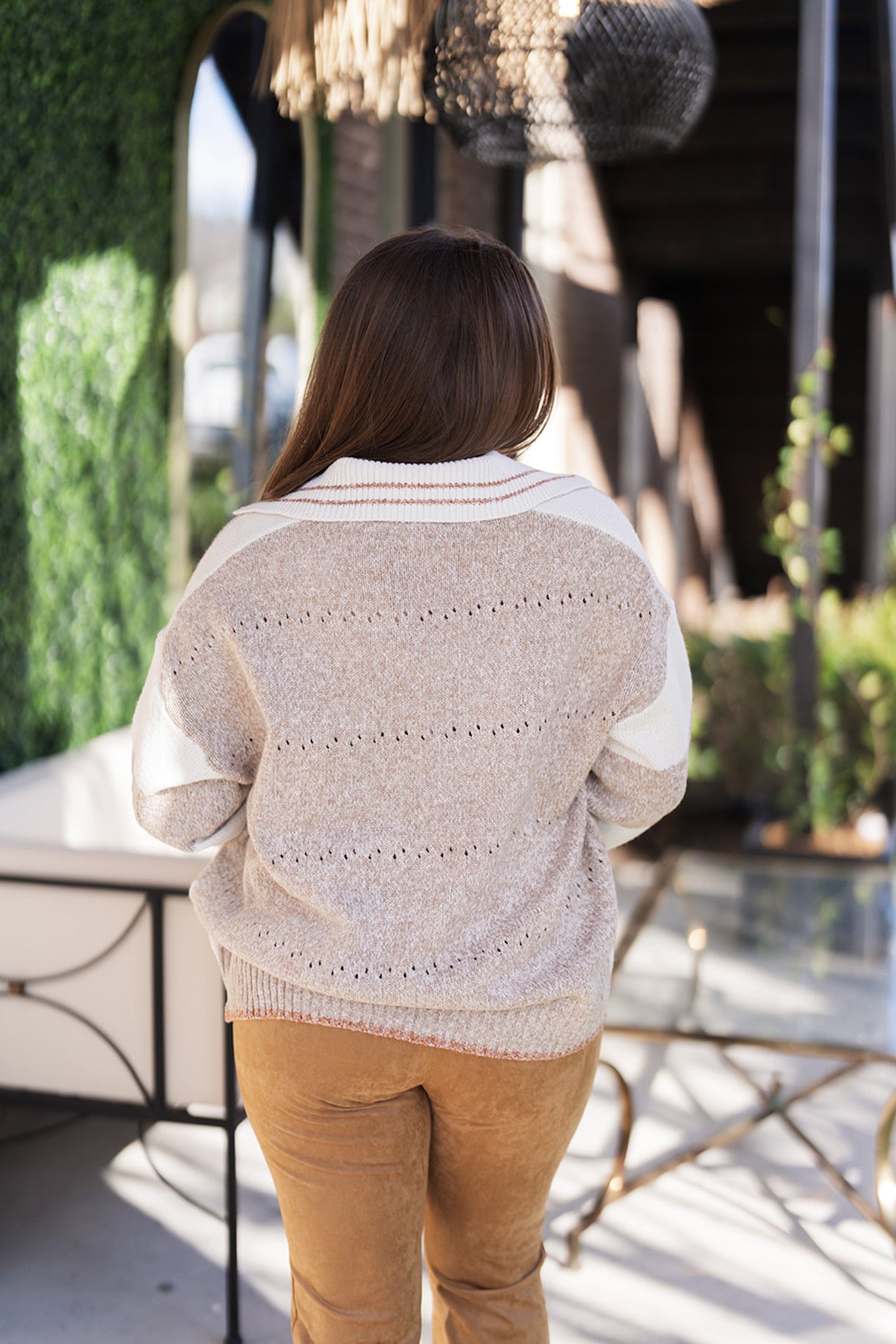 This versatile knitwear piece transitions effortlessly from a relaxed weekend outing to a casual office setting. The thoughtful design includes a modern hi-lo hem, which provides both a flattering fit and easy coverage, perfect for pairing with your favorite corduroy pants (like the ones shown in the image) or classic denim jeans. For an extra dash of unexpected style, the color blocked back offers a subtle shift in the stripe placement, ensuring a memorable look from every angle. This sweater is a must-have piece for anyone seeking high-quality, fall fashion that is both comfortable and on-trend. Add the Oatmeal Latte Sweater to your wardrobe and experience the perfect combination of classic comfort and modern charm.