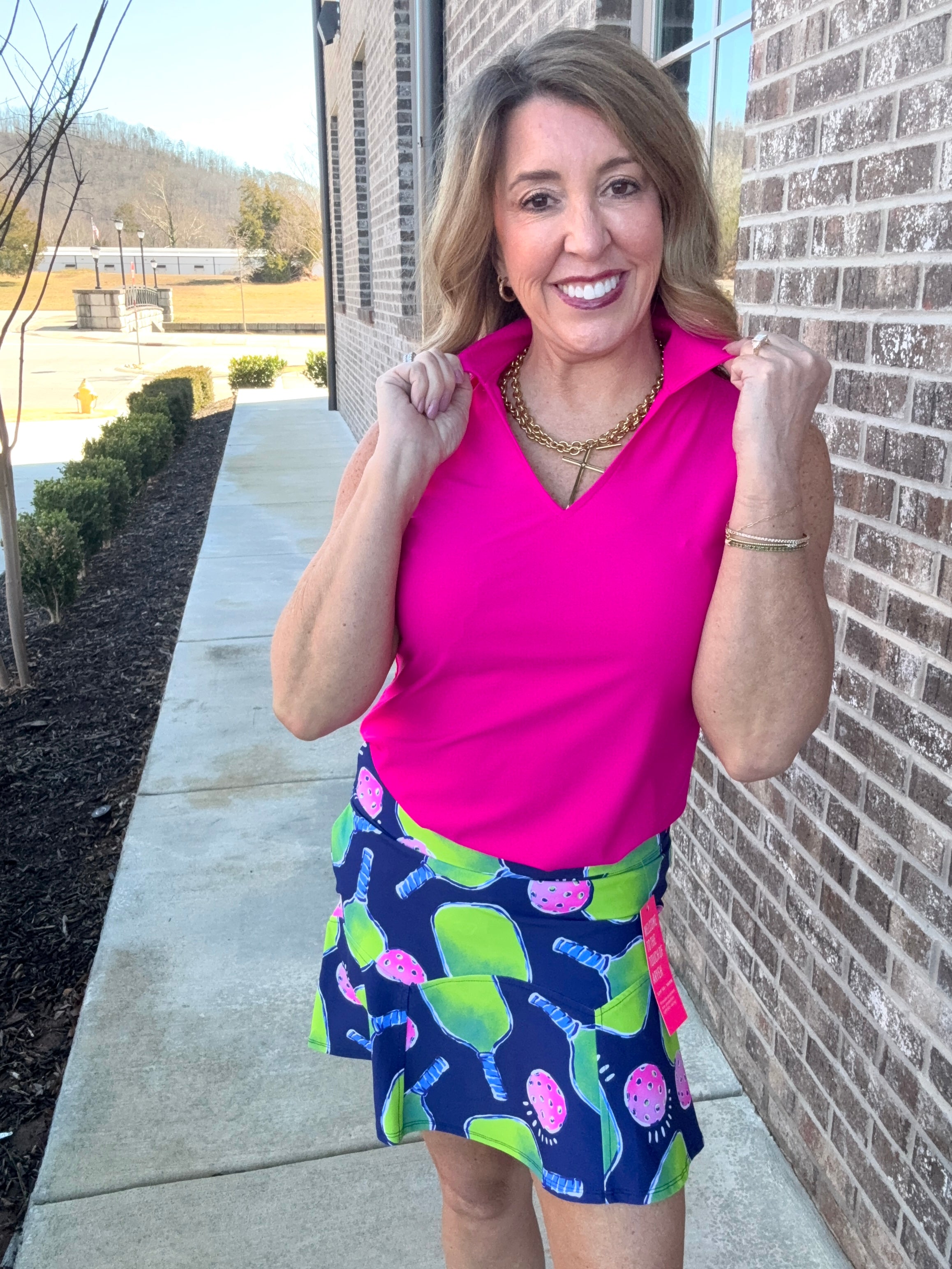 The Pink Punch Polo features a classic V-neckline paired with a crisp, structured collar, offering a refined look that balances sportiness with feminine elegance. Crafted from a premium, high-stretch performance fabric, it provides a silky-smooth feel against the skin while offering the breathability and moisture-wicking properties necessary for active days in the sun. The sleeveless design ensures a total range of motion for your golf swing or pickleball serve, while the tailored fit and slightly curved hemline provide a flattering, streamlined silhouette when worn tucked in or left out. Shown here in a show-stopping Hot Pink, this top serves as a bold anchor for any athletic or casual ensemble, ensuring you look perfectly polished from the first set to the final sip of a post-game cocktail.