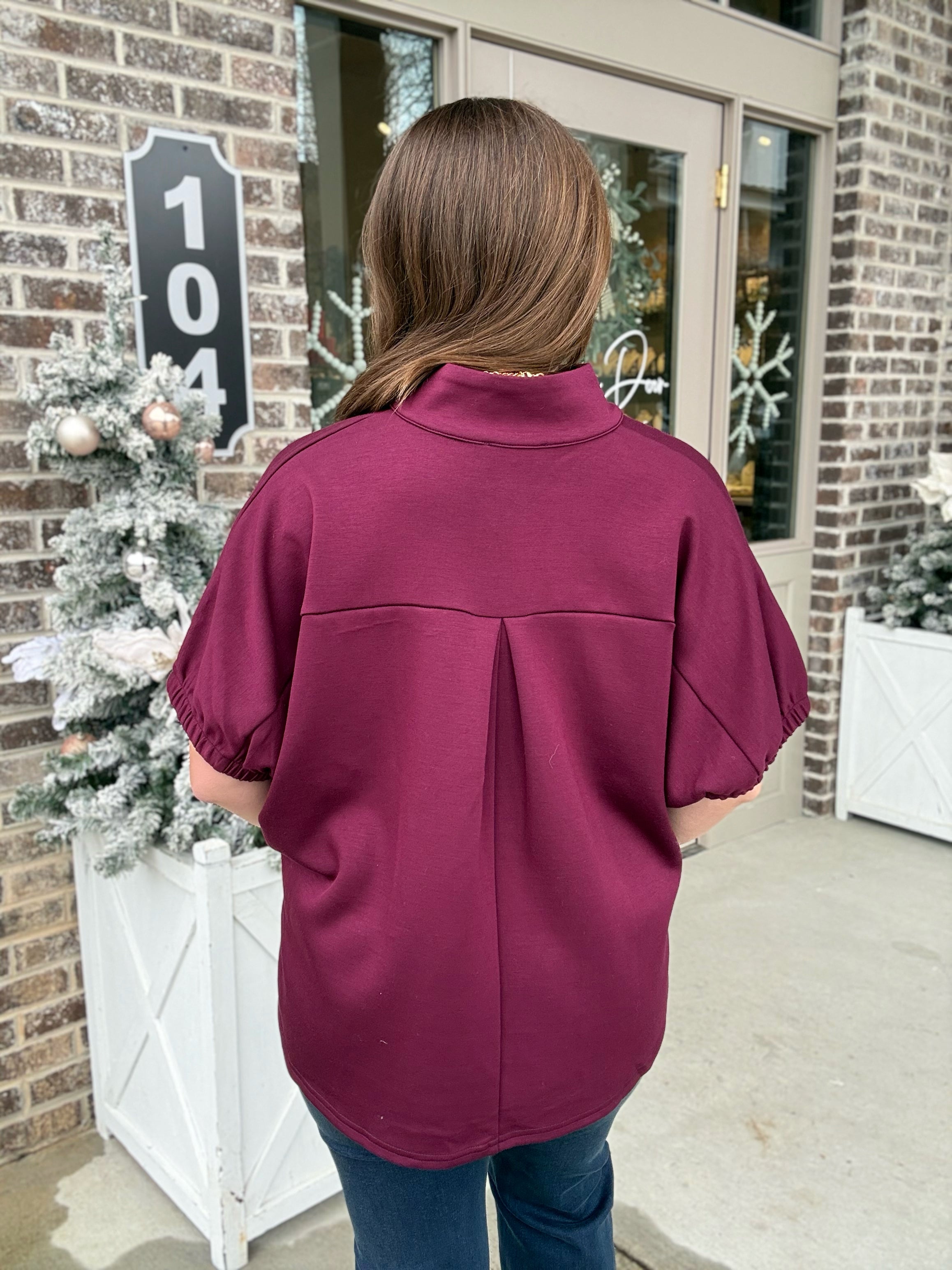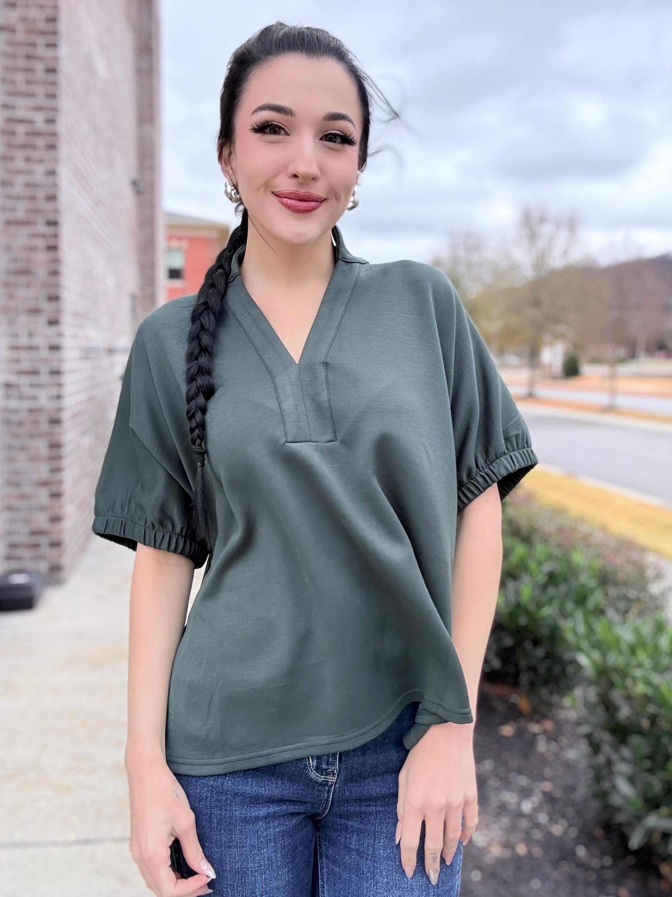 The Ruffled Solstice Blouse is thoughtfully designed for an incredibly comfortable and flattering fit. It features a unique mandarin collar that flows into a deep V-shaped notch placket, creating a refined neckline. The silhouette is relaxed and flowy, balanced by short puff sleeves with gentle gathering at the cuffs, adding a touch of feminine volume. The combination of the structured collar and soft, voluminous sleeves makes this blouse a perfect staple for a chic, put-together look.