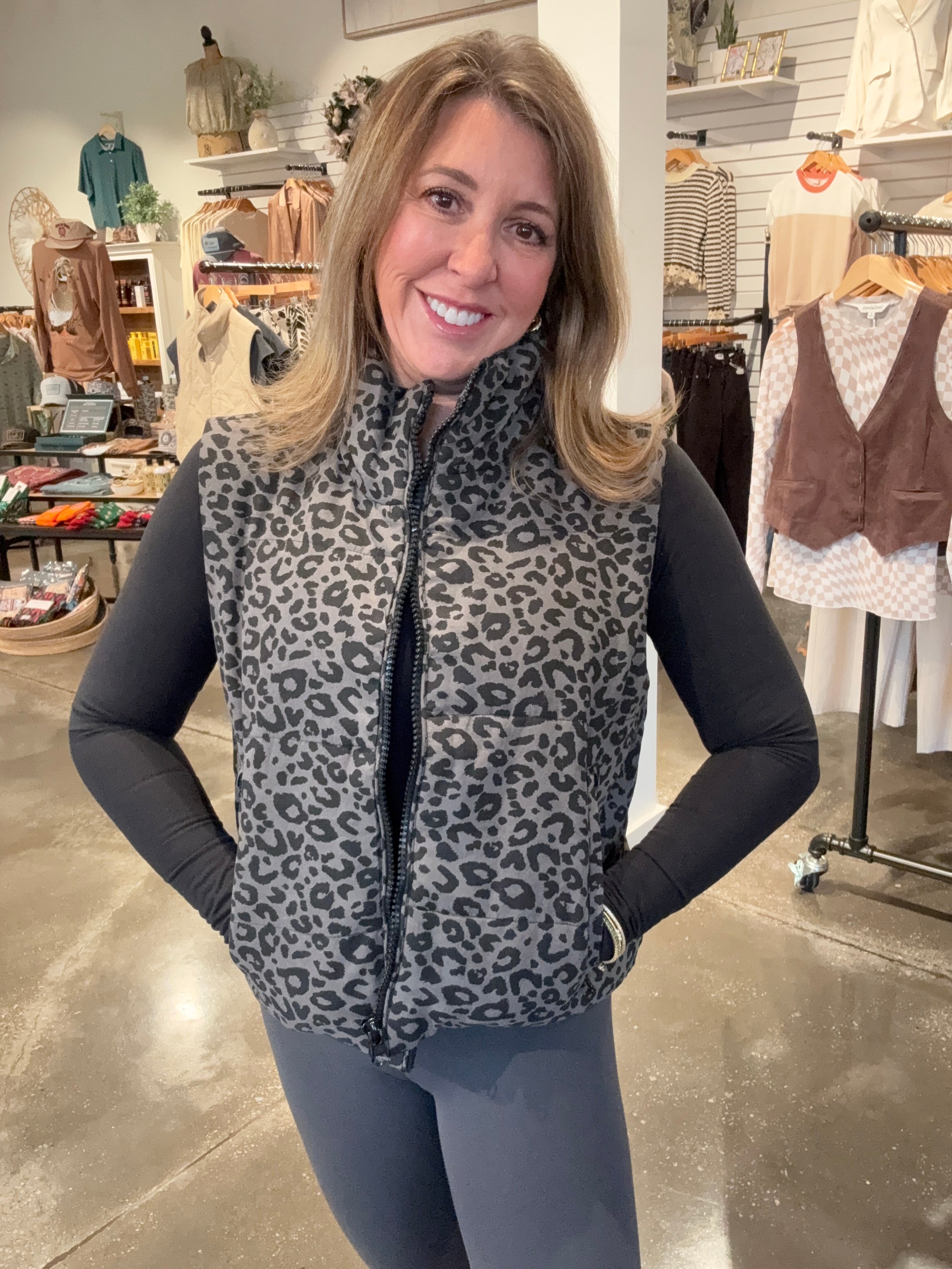 The Shadow Leopard Puffer Vest is best styled over solid pieces to let the print pop.