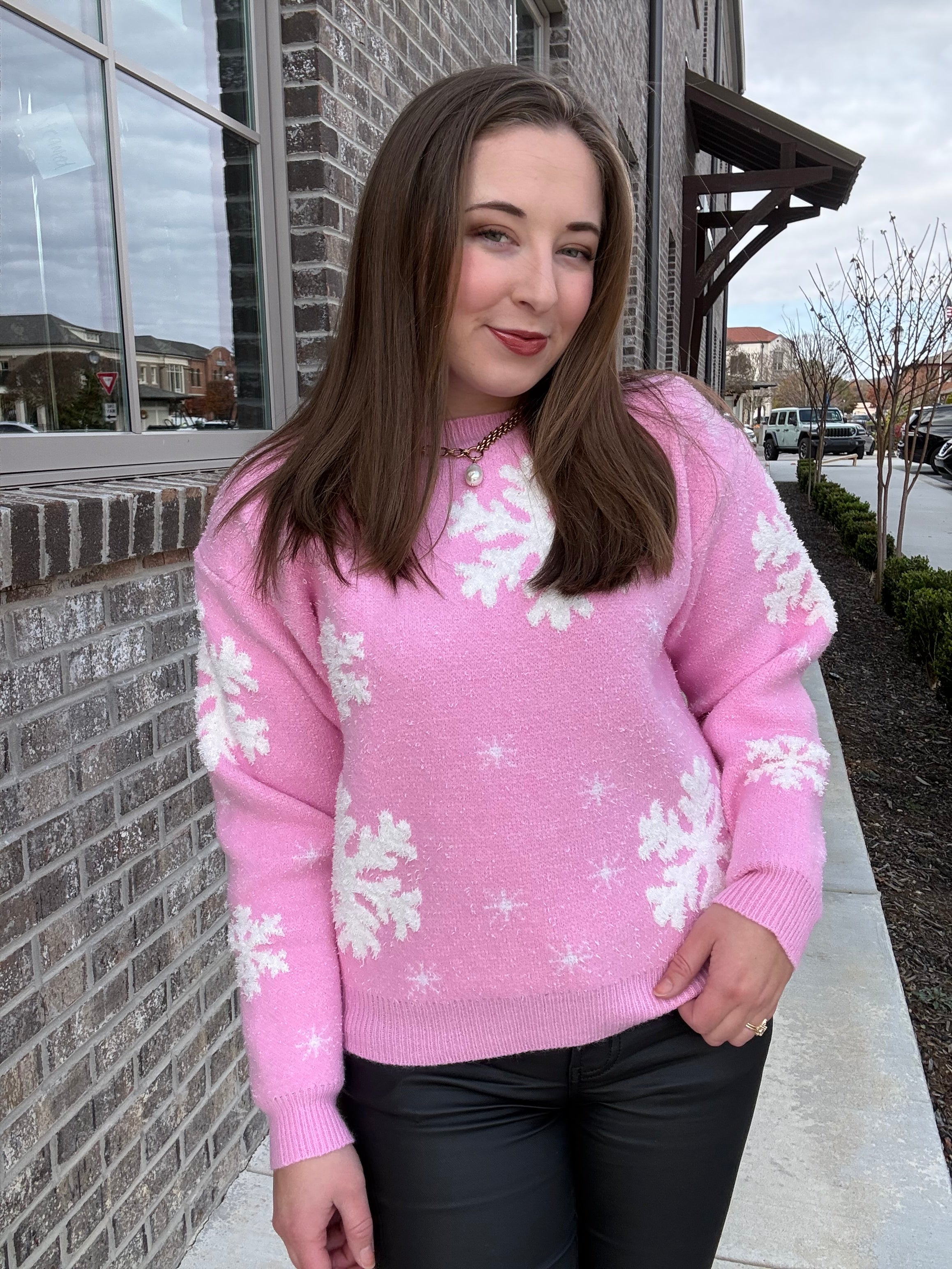 Embrace the magic of the season with our Sugarplum Snowflake Sweater, a charming blend of holiday cheer and cozy comfort. This festive top features delicate snowflake artwork in soft pink tones, perfect for creating those Instagram-worthy Christmas moments. The thoughtfully designed pattern captures the whimsy of winter while the quality knit keeps you warm through holiday gatherings, parties, and casual winter days. Whether you're decorating, shopping, or simply spreading seasonal joy, this sweater becomes an instant favorite that celebrates the beauty of the holidays in style. Make it your go-to piece for a festive wardrobe that feels both elegant and playfully merry.