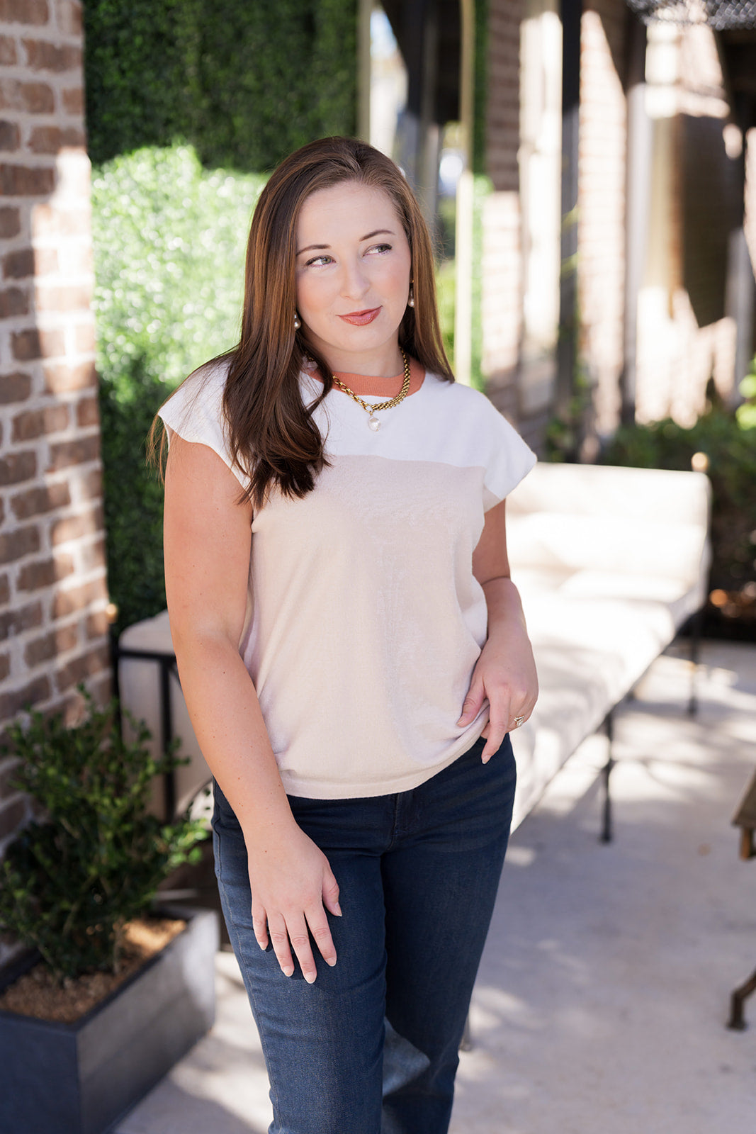 Embrace effortless, relaxed style with The Sunset Coast Knit Tank, a beautifully color-blocked piece that captures the soft hues of the horizon. This women's top is crafted from a soft, fine-gauge knit, giving it a cozy feel and a comfortable, figure-flattering drape. The design features a bold horizontal color block, blending a crisp white on top with a warm peach/coral shade below, while the ribbed trim on the neckline is a deep rust/orange color, adding a final touch of sophistication.