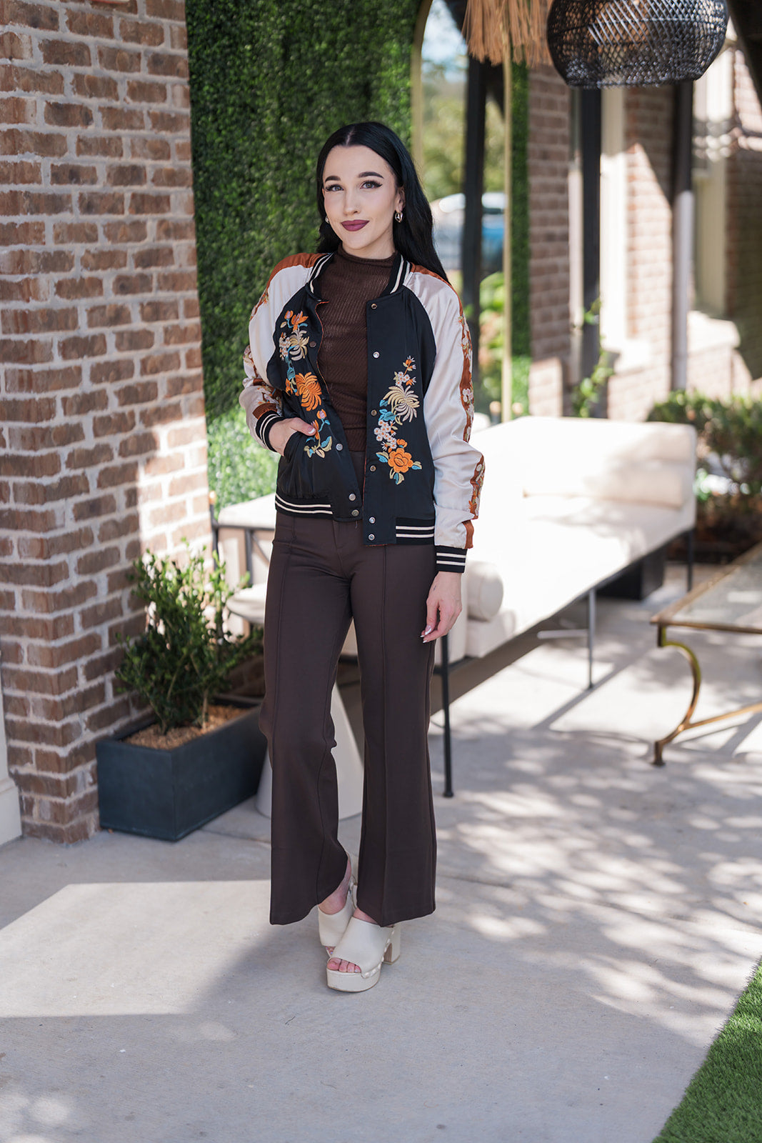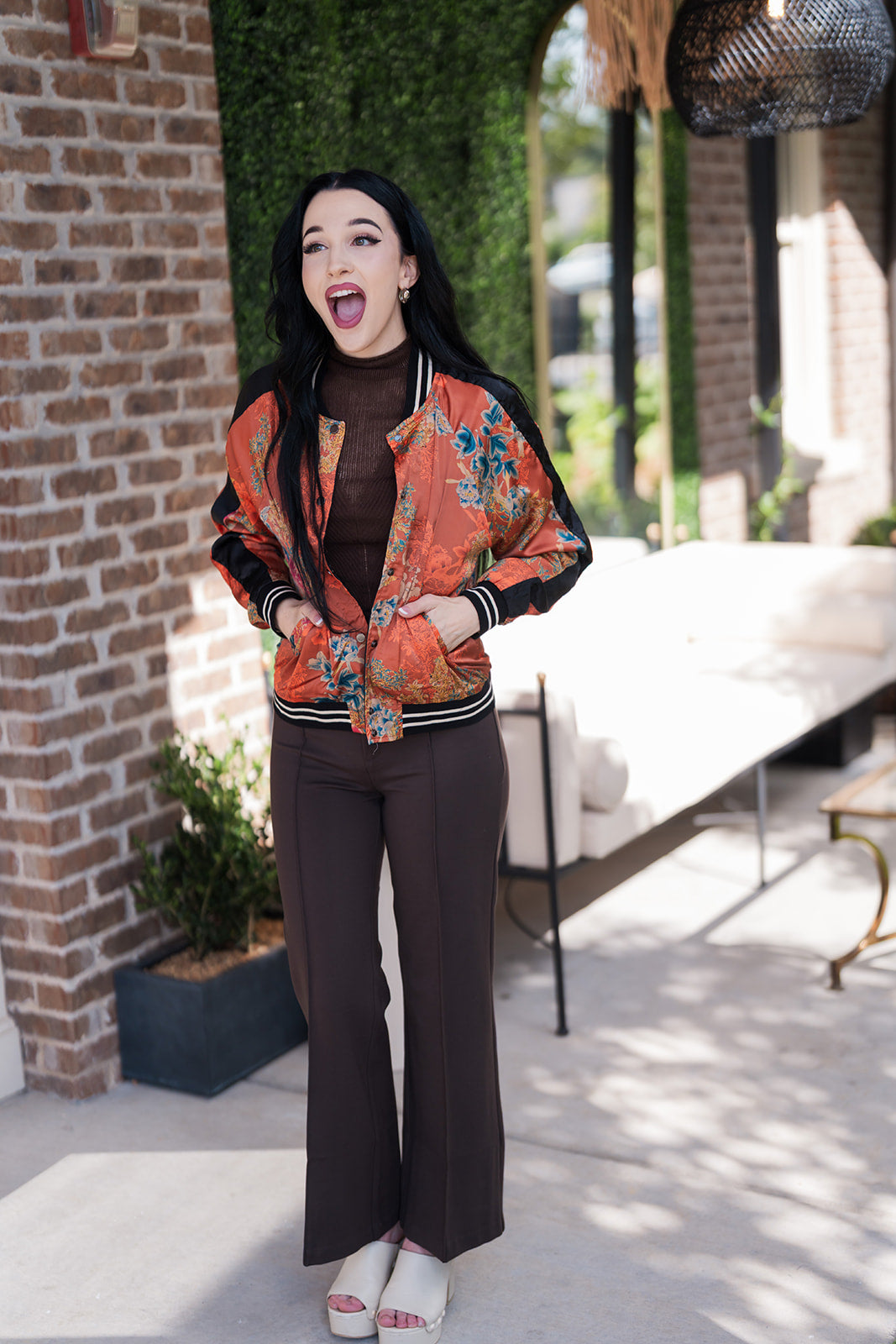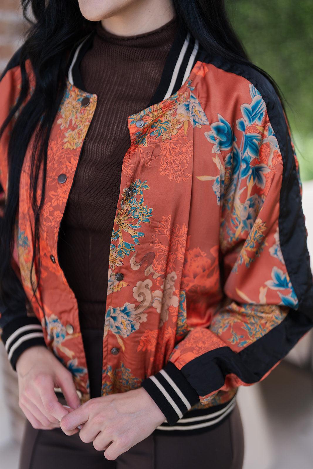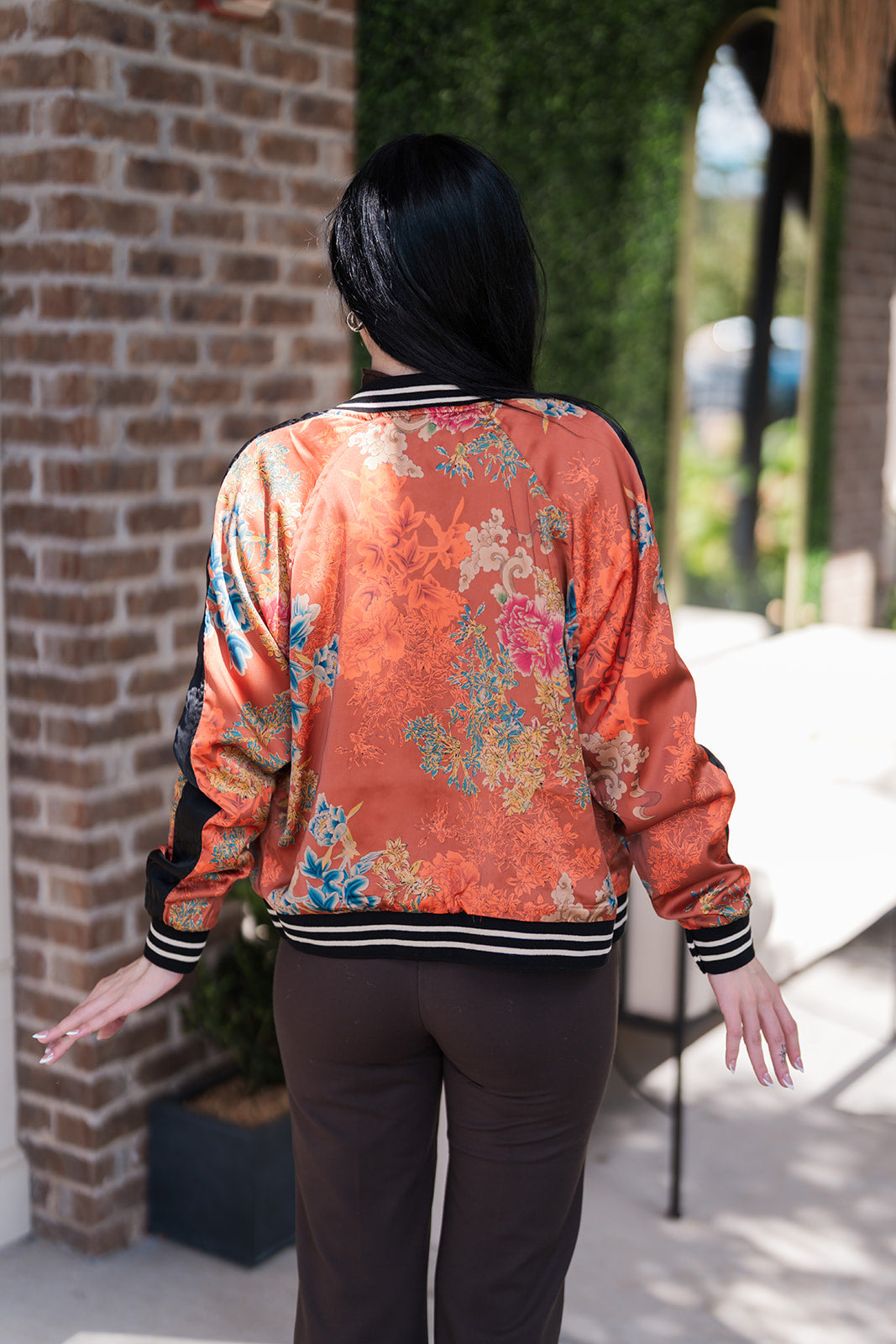 Discover the ultimate in versatile style with The Eastern Dream Jacket, a reversible bomber that gives you two show-stopping looks in one. This women's jacket is a true work of art, crafted from a smooth, silky satin that feels luxurious to the touch. On one side, it features a captivating floral print in a rich palette of rust, blue, and tan, evoking the feel of an elegant, vintage tapestry. The contrast black and white ribbed trim adds a classic finish, making this side perfect for a sophisticated, bohemian-inspired outfit.