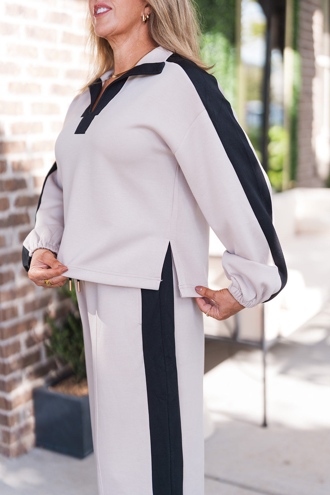 Elevate your casual style with The Sideline Top, the perfect blend of sport-inspired flair and cozy comfort. This is more than just a long-sleeve knit top; it’s a modern essential designed to make you feel polished and relaxed. The sharp contrast collar and bold stripe detail on the sleeves create a striking, athletic-inspired look that's both current and timeless. It’s the kind of top you can throw on and instantly feel put-together, whether you’re headed to the coffee shop or lounging at home. Pairs perfectly with our The Sideline Pants for a coordinated look.