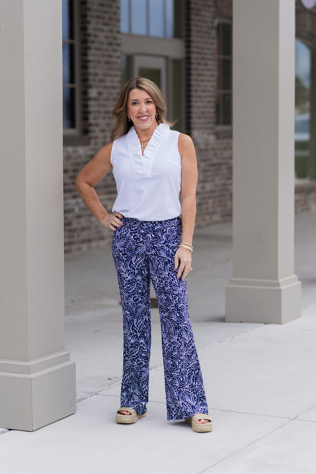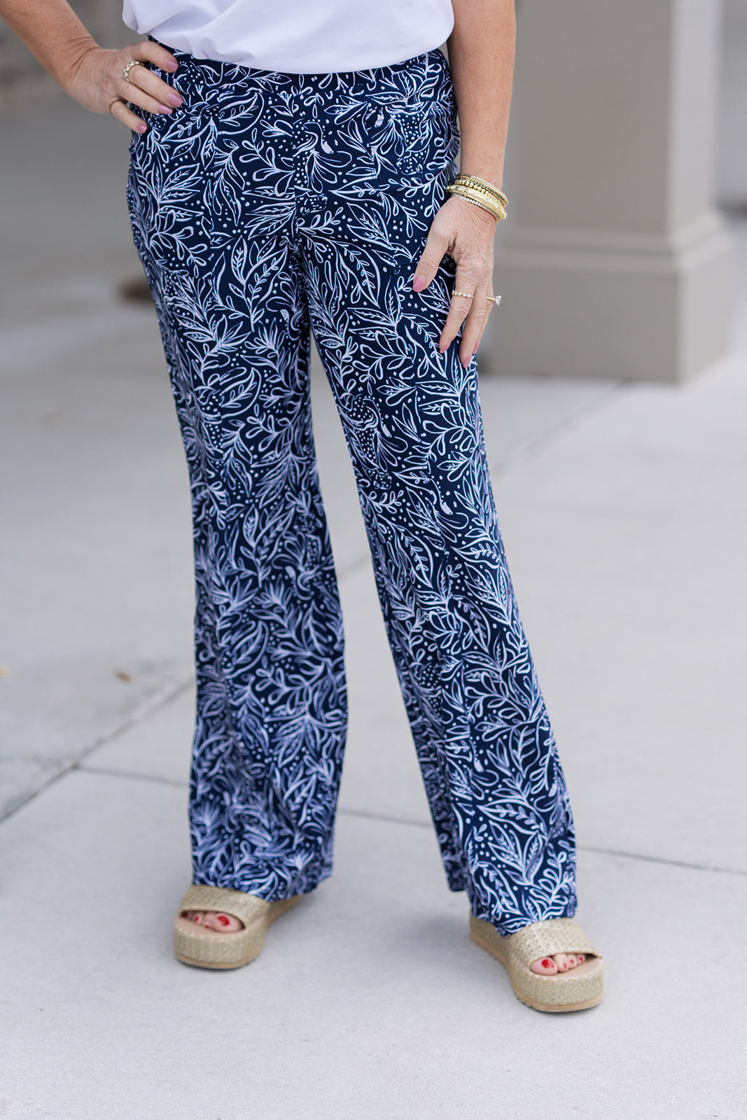 For a quintessential nautical look, pair the Midnight Maritime Pants with a crisp white button-down or a striped bateau-neck top. Tuck your shirt in to highlight the gold button detailing and add a pair of tan wedge espadrilles for a polished, vacation-ready vibe.