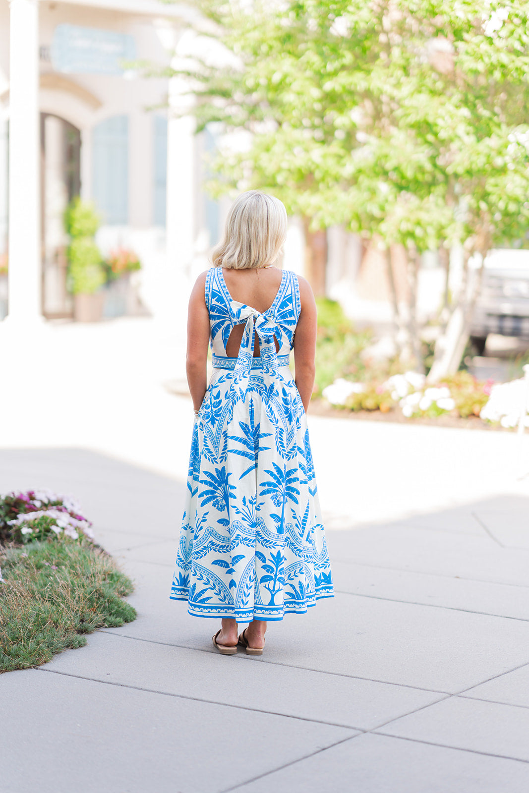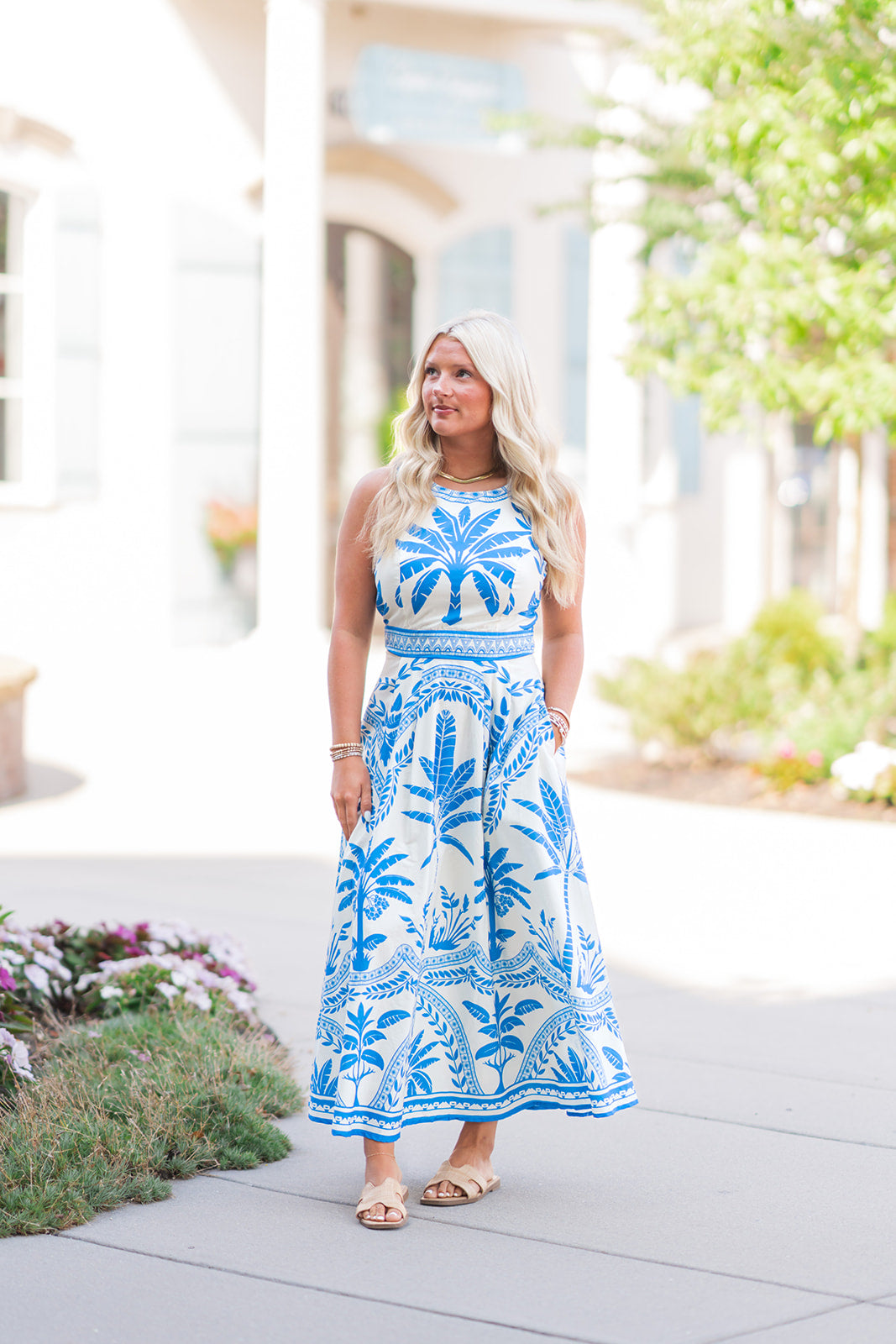 Elevate your wardrobe with the Palm Mirage Midi Dress, designed to flatter every silhouette. This printed woven dress features a graceful round neckline and sleeveless cut for effortless style. The flowing circle skirt adds movement and charm, while the tie-back detail and zipper closure ensure a perfect fit. Ideal for day-to-night wear, this dress combines comfort and elegance to make you stand out with ease.