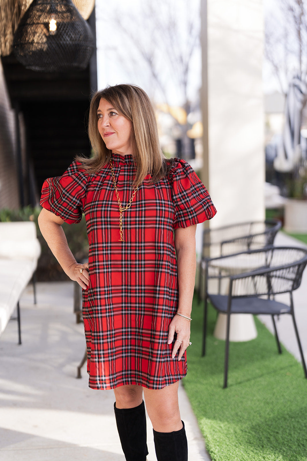 Wear with a bold red lip and gold statement earrings to enhance the festive tones of the plaid pattern.