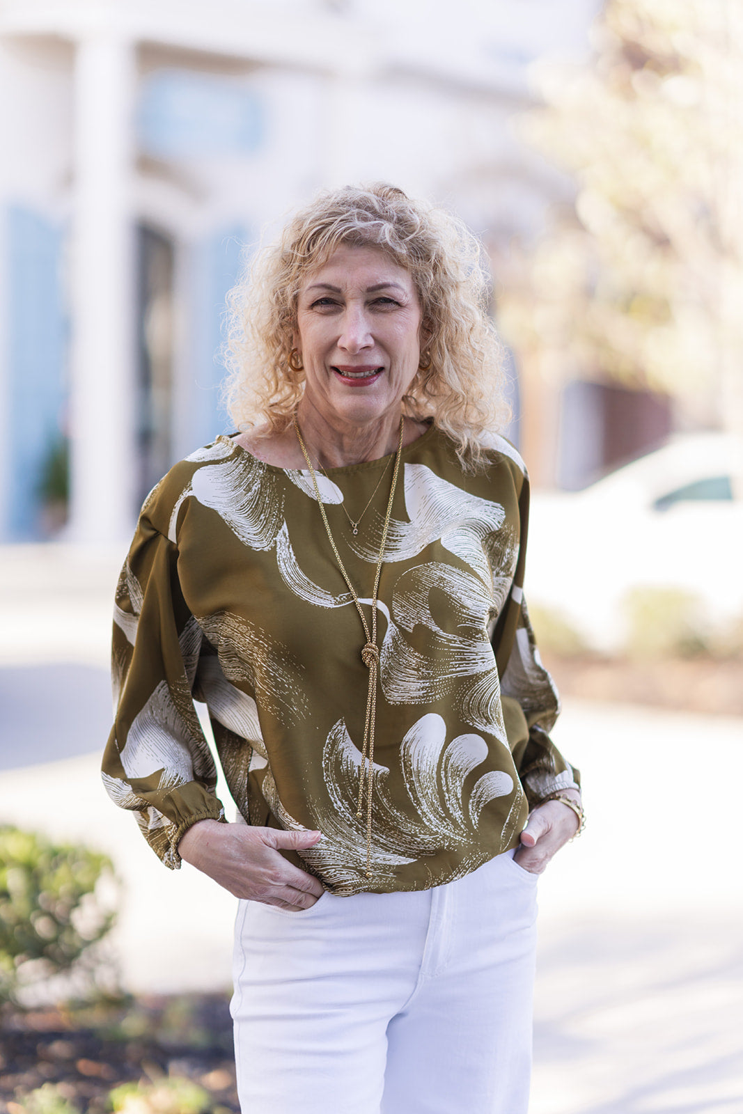 To keep it casual for a weekend brunch, style this top with high-waisted distressed denim and tan leather slides. Roll the sleeves slightly to enhance the relaxed feel and add a few stacked gold bracelets. For an edgy evening ensemble, tuck it into a black leather mini skirt and finish the look with ankle boots and a sleek clutch to let the vibrant moss print be the star of the show.