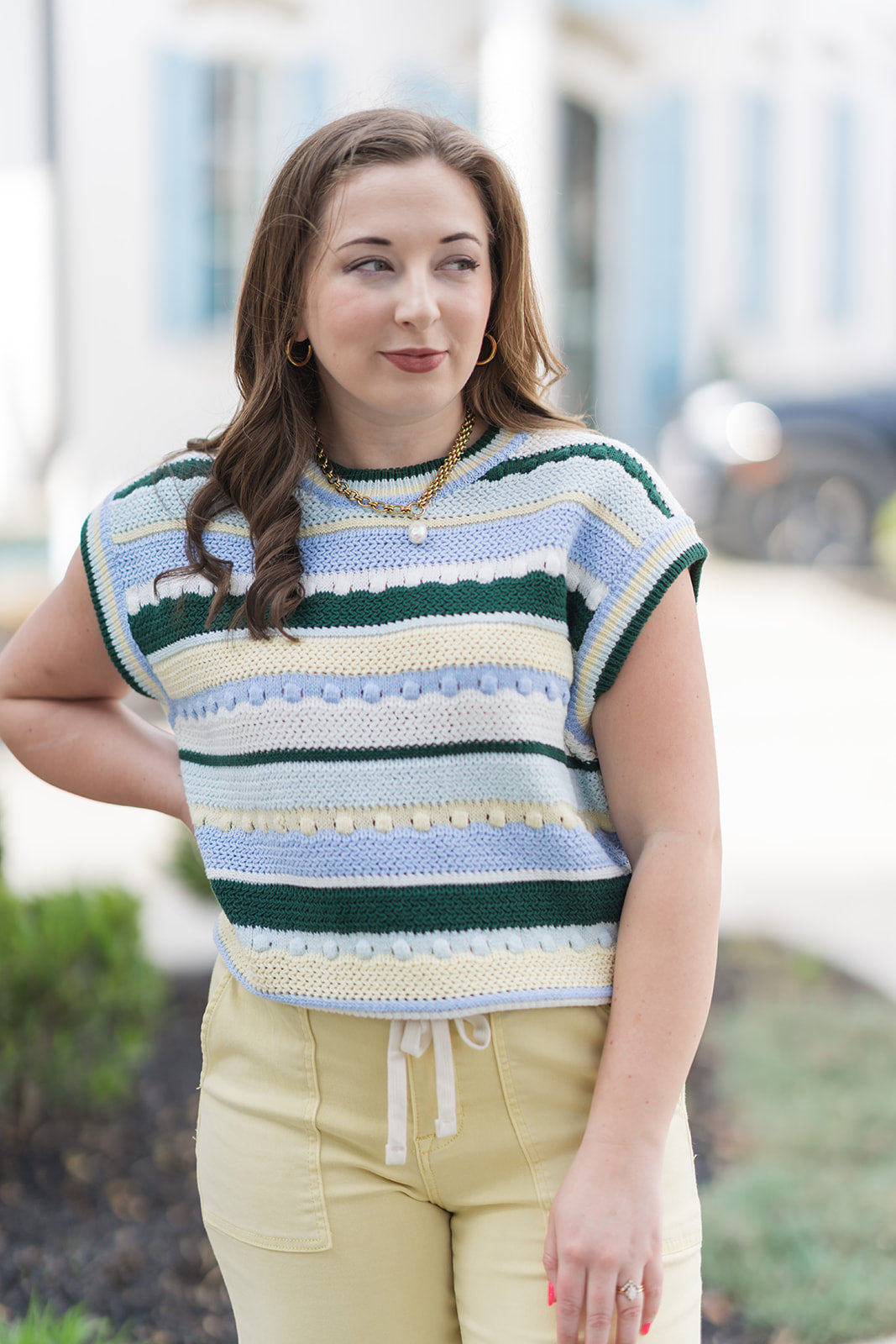 For a fresh, nautical-inspired look, pair the Bay Breeze Stripe Knit with high-waisted white denim or linen trousers. Tuck the sweater in slightly to accentuate your waistline and finish the outfit with tan leather slides and a woven straw tote. This ensemble is perfect for a weekend getaway or a casual Spring brunch.